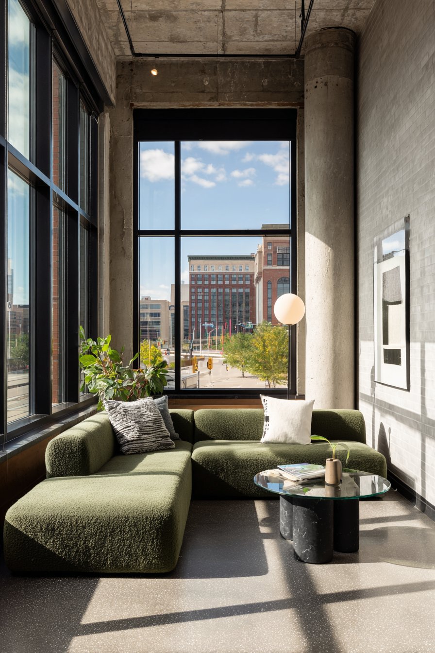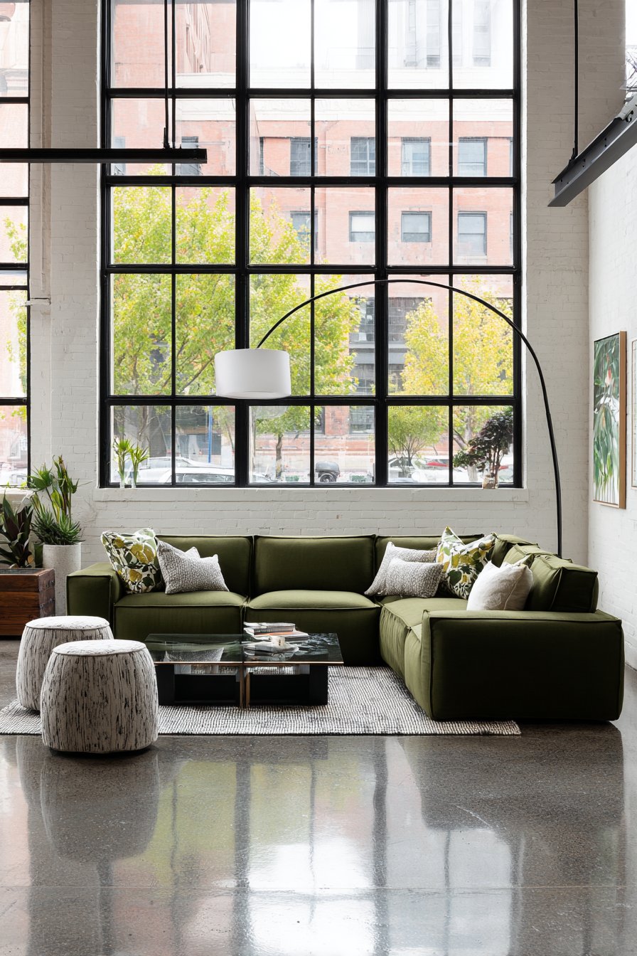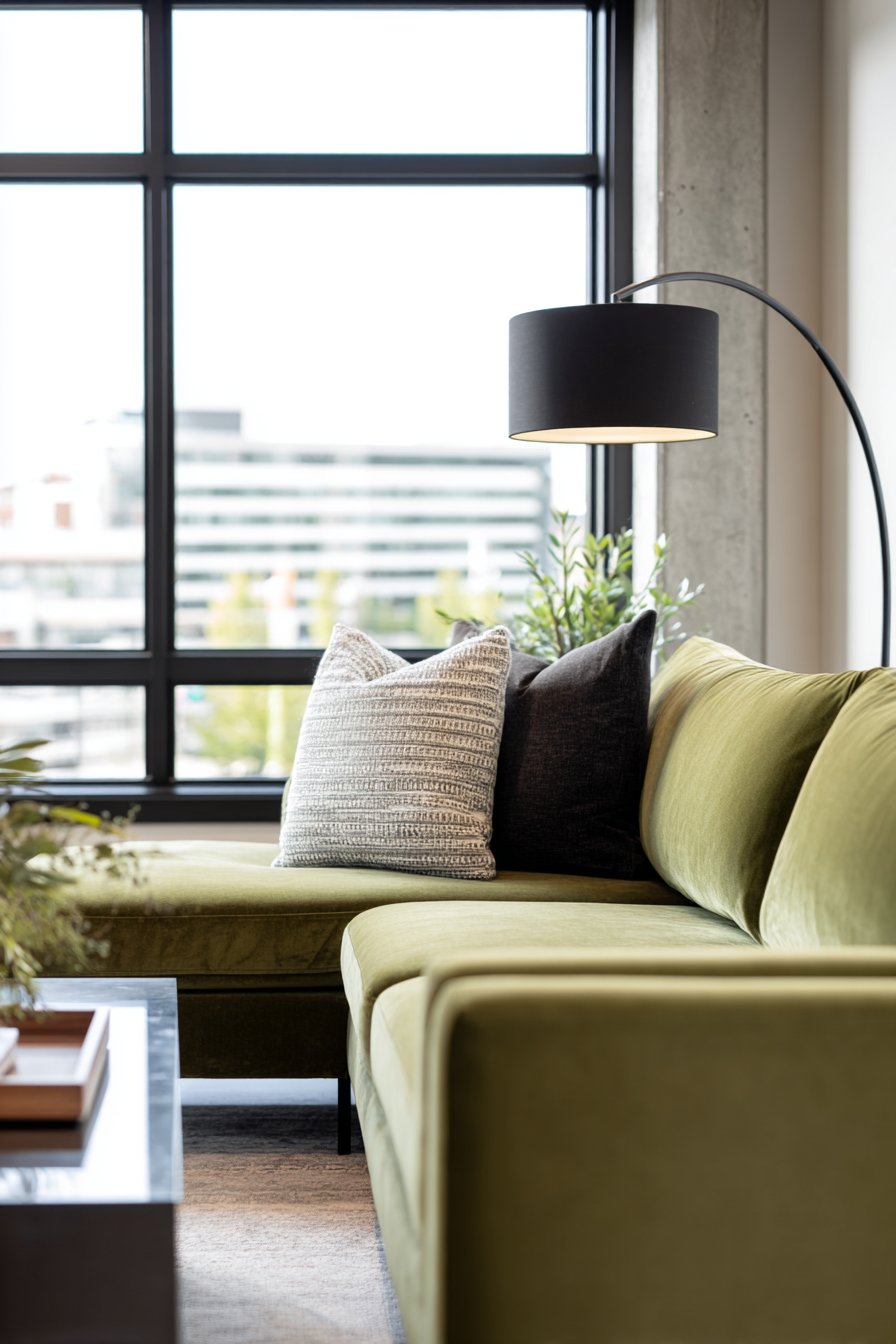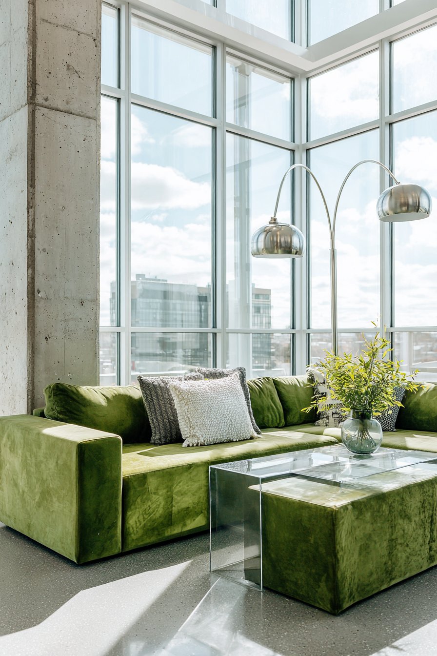 The moss green sofa is accented with monochromatic pillows in slightly varied shades, creating tonal interest without introducing additional colors. A single sculptural floor lamp provides both illumination and art object status, its clean lines and interesting form contributing to the room’s curated, gallery-like atmosphere. The minimal coffee table in smoked glass maintains the uncluttered aesthetic while providing necessary function, its transparency preserving sightlines and visual spaciousness. Natural light and shadow play throughout the day, creating ever-changing compositions that showcase the moss green sofa’s sophisticated color and the space’s architectural qualities.