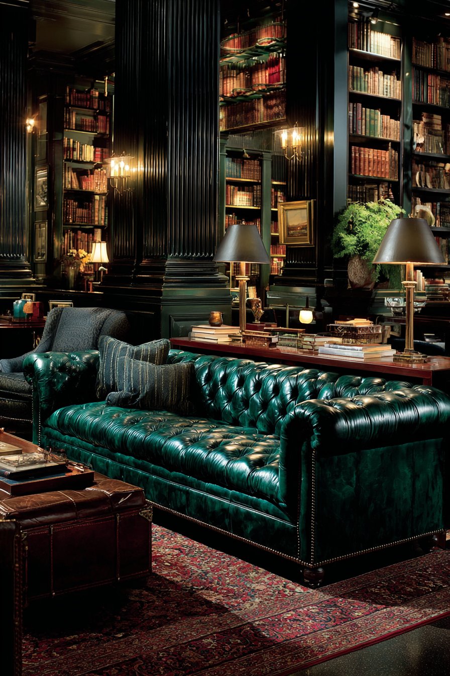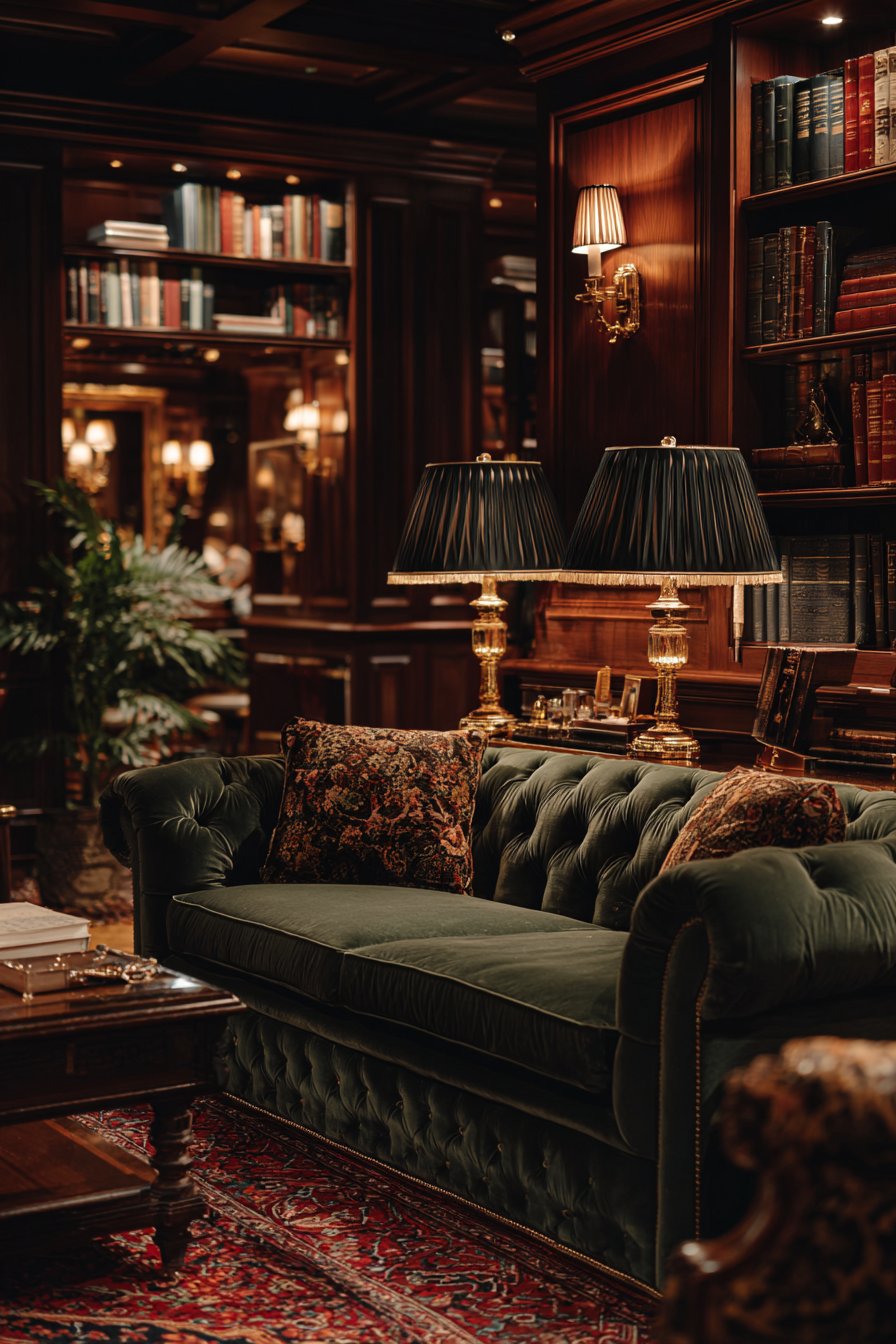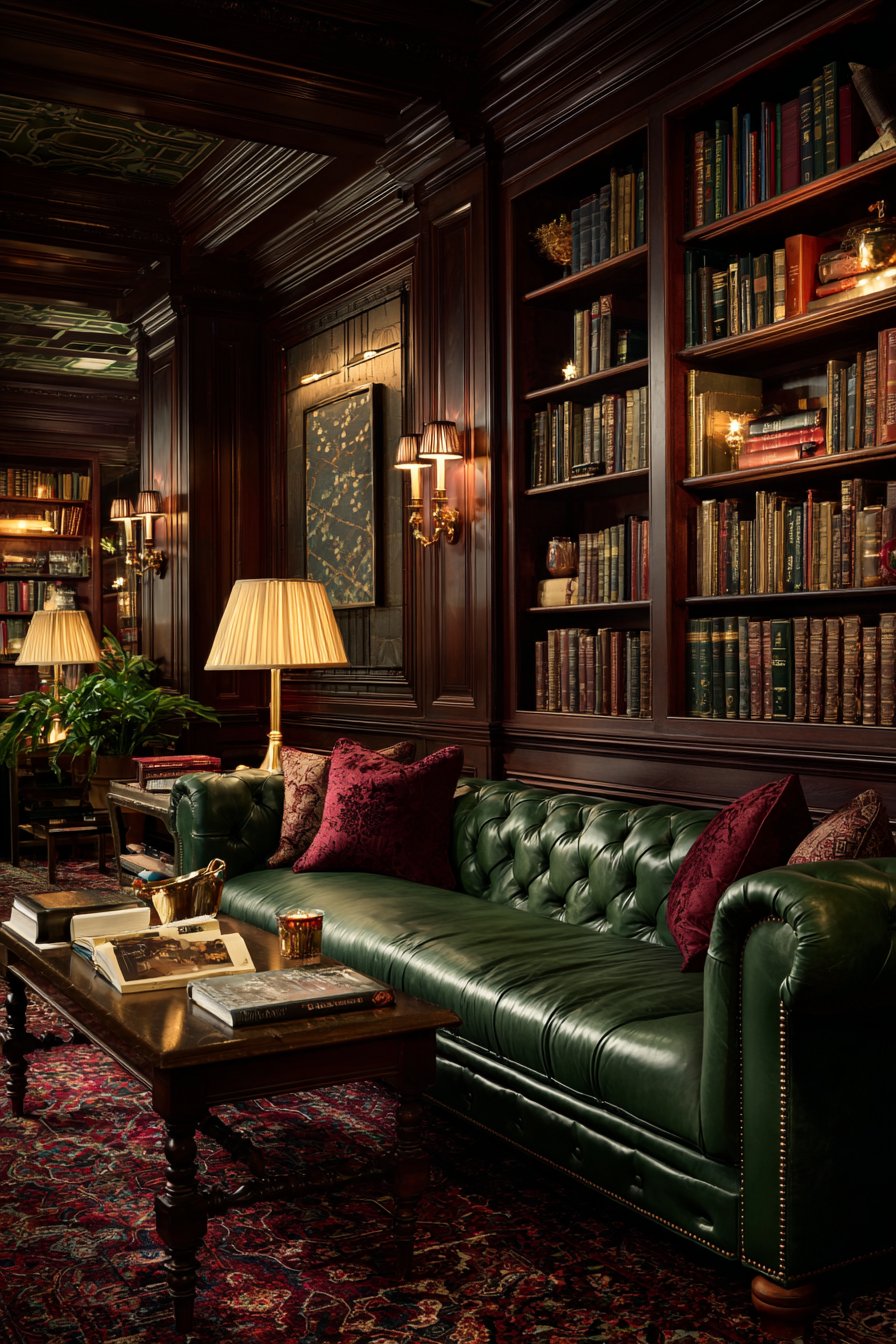 A Persian rug in burgundy and navy tones grounds the seating area while adding pattern and additional richness to the already layered space. Brass table lamps with fabric shades provide warm, focused light perfect for reading, their traditional proportions and quality materials echoing the room’s overall aesthetic. Warm ambient lighting from wall sconces creates intimate shadows and highlights, making the space feel like a private retreat from the modern world. This is a room designed for contemplation, for reading important books, for conversations about meaningful subjects—the forest green Chesterfield sofa inviting occupants to settle in and stay awhile.