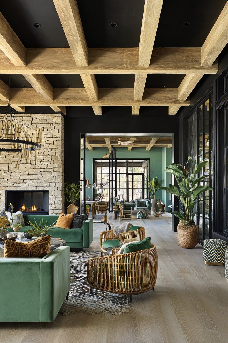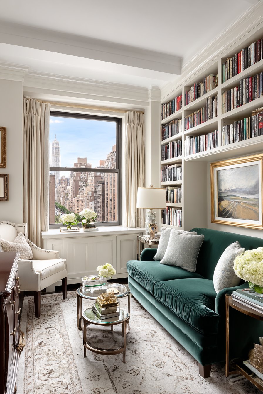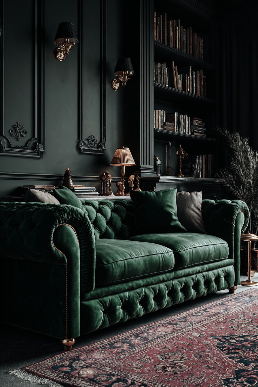 Key Design Tips: Invest in quality furniture with excellent construction and durable materials that will last decades. Incorporate architectural details like wood paneling, crown molding, and built-in shelving. Choose traditional furniture silhouettes like Chesterfields, wingbacks, and camelback sofas. Layer rugs, particularly oriental or Persian styles, to add pattern and warmth. Use warm, focused lighting rather than bright overhead illumination. Display books and collected objects that reflect intellectual interests and cultural sophistication. Maintain a rich but restrained color palette anchored by deep, saturated greens, burgundies, and navy blues.