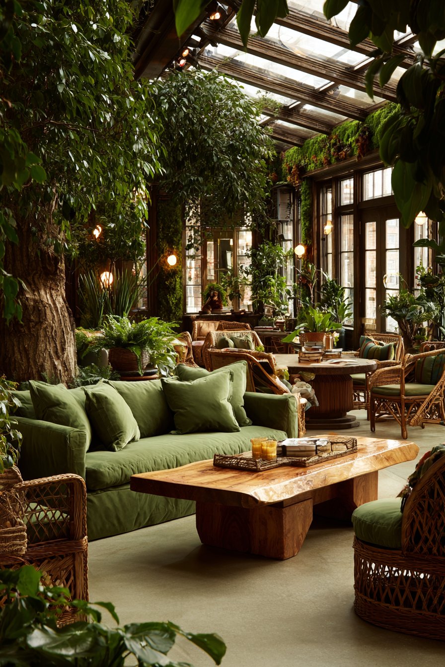 Natural wood coffee table with live edge detail celebrates the tree’s original form, its irregular edge preserving the boundary between bark and air. Rattan accent pieces introduce additional natural materials and textures while their lighter weight and open construction prevent the abundance of plants from making the space feel heavy or oppressive. Skylights and large windows provide the ample natural light essential for plant health while creating connection to exterior conditions—clouds moving overhead, changing seasons, progression from dawn to dusk. The olive green sofa becomes a comfortable perch from which to enjoy this indoor garden, a place to sit surrounded by living beauty.
