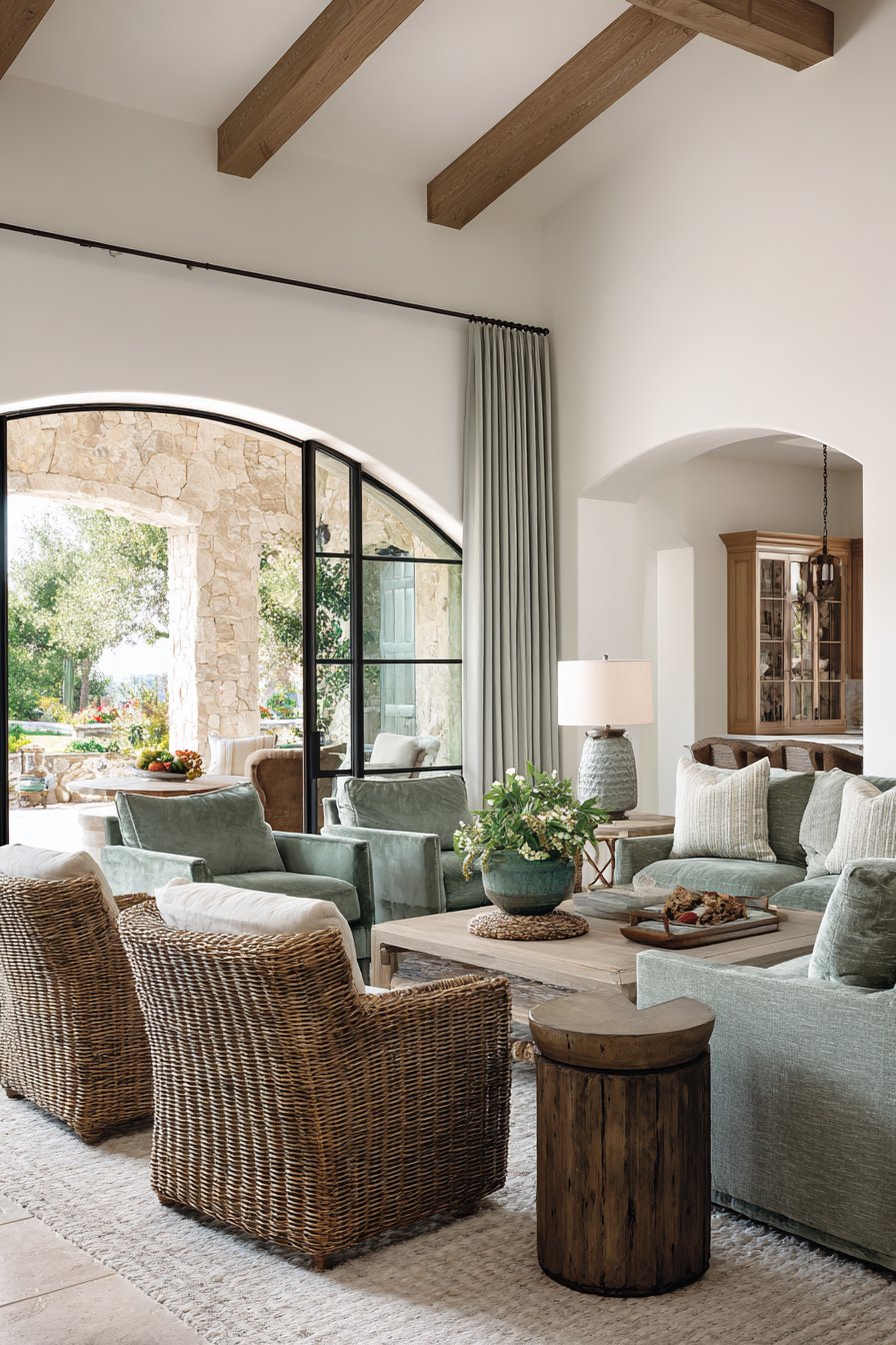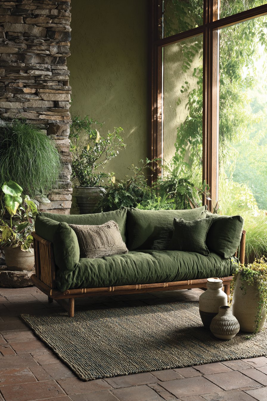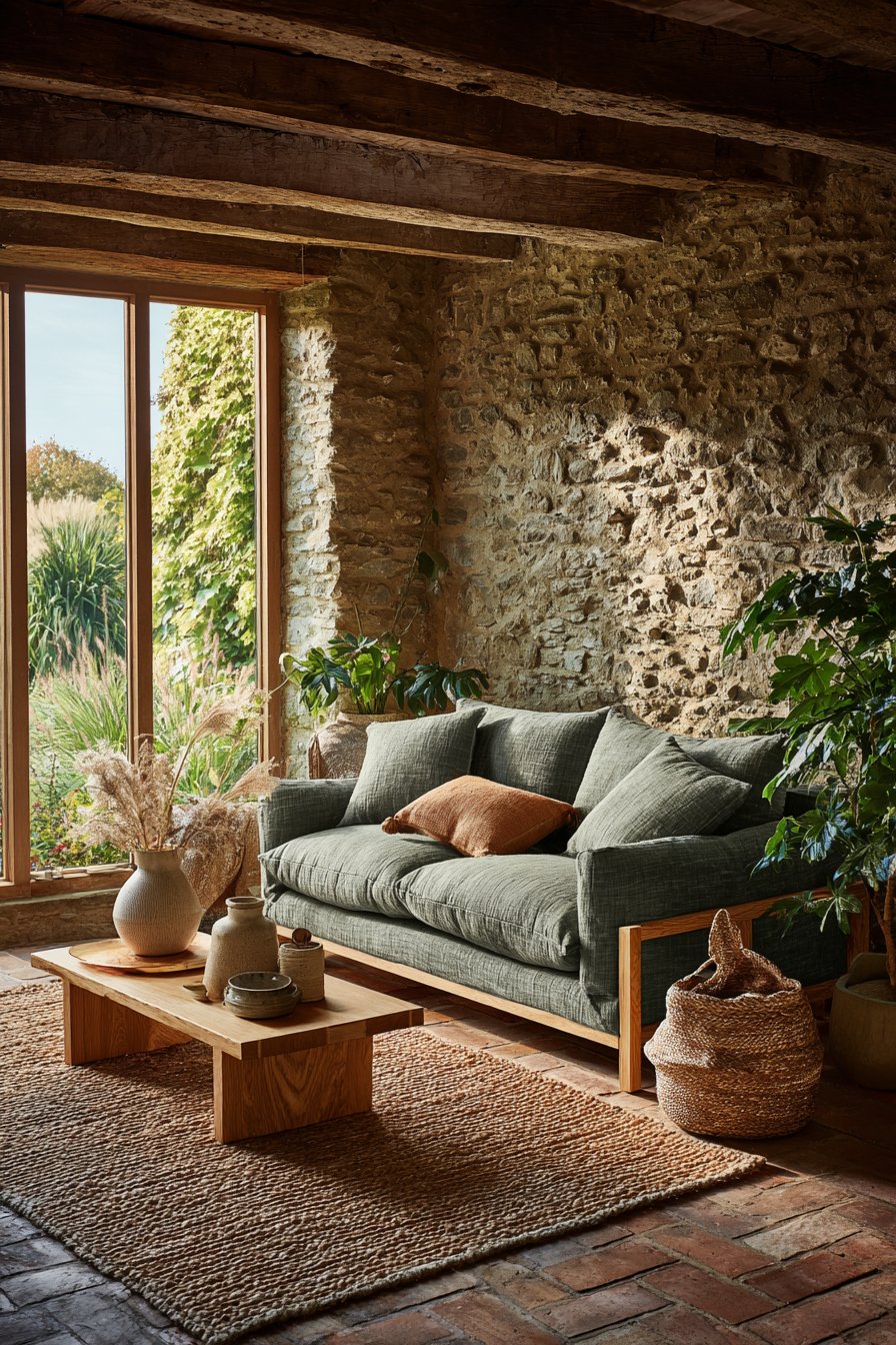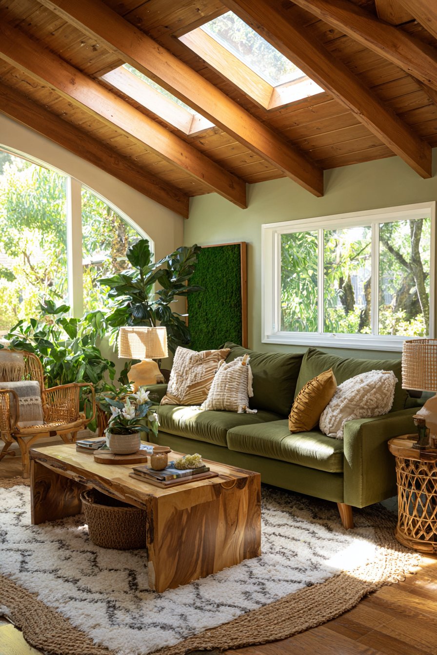 Handwoven wool rug, ceramic vessels, and live-edge wood coffee table emphasize organic textures and artisanal craftsmanship. These pieces show the maker’s hand and nature’s influence—the rug’s slight irregularities from hand weaving, the ceramic’s glaze variations from kiln firing, the coffee table’s preserved natural edge showing where tree met air. Large windows frame garden views, dissolving boundaries between interior and exterior while bringing changing seasonal beauty indoors. The moss green sofa becomes a comfortable perch from which to appreciate both the curated natural materials inside and the living nature visible outside.
