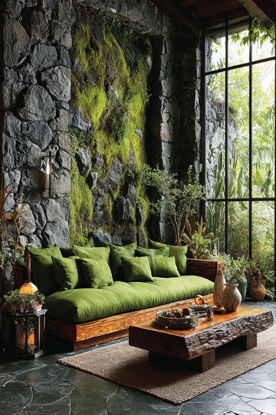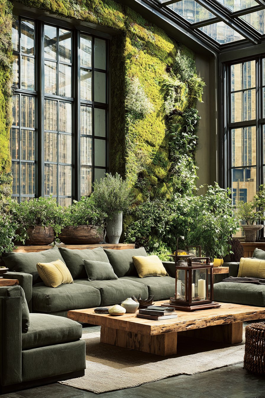 A living moss wall behind the sofa creates a dramatic natural backdrop that purifies air, absorbs sound, and provides ever-changing organic texture. This isn’t static decoration—it’s a living system that grows and changes, requiring care and attention just like the other plants in the space. The presence of so much living greenery improves air quality while providing psychological benefits documented in biophilic design research: reduced stress, improved focus, enhanced creativity, and general sense of wellbeing.