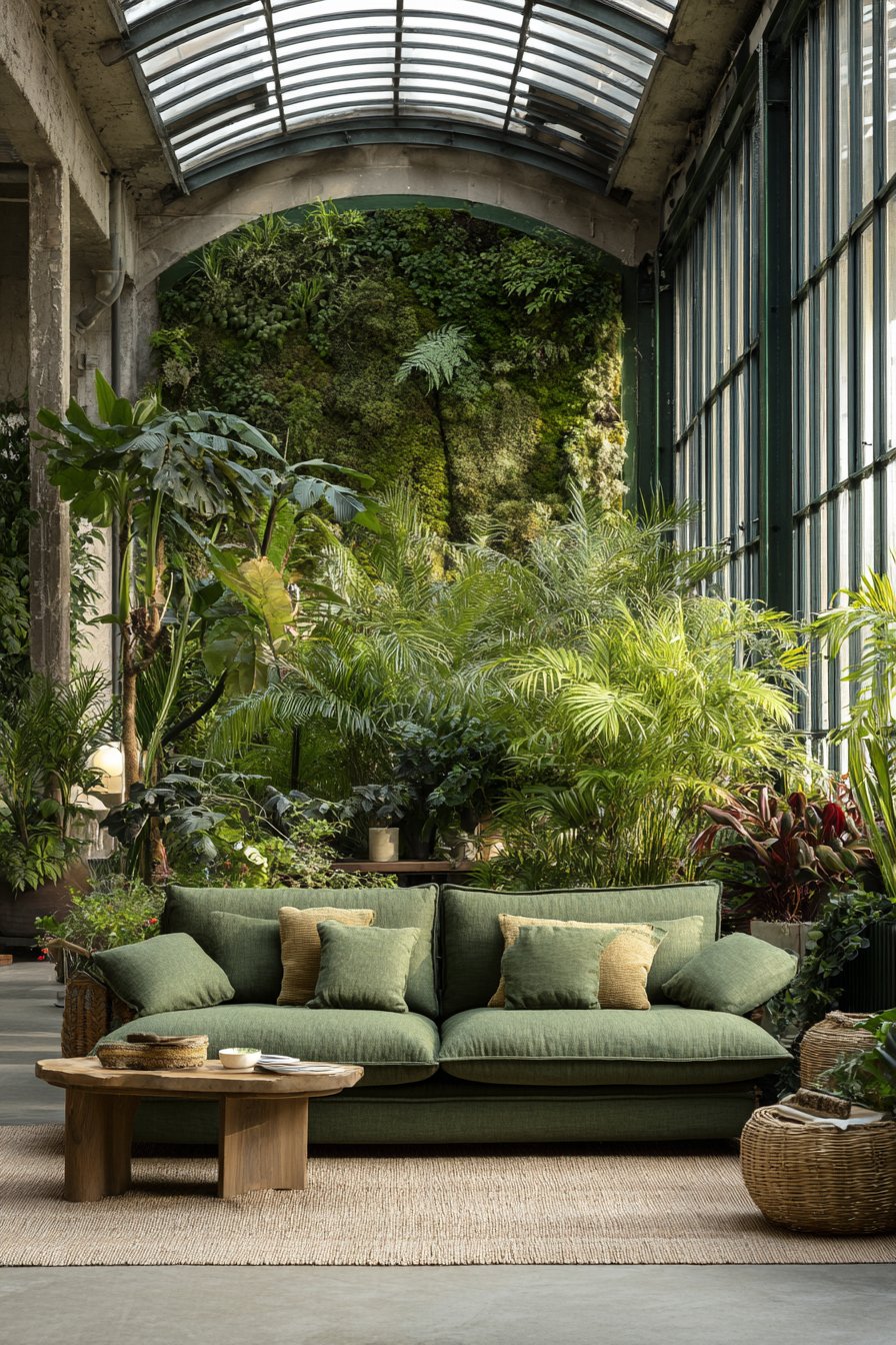 Biophilic design consciously incorporates natural elements and systems into built environments, recognizing humans’ innate need for connection with nature. An olive green organic cotton sofa surrounded by abundant indoor plants of varying heights brings this philosophy to life, creating a living room that feels more like a conservatory or indoor garden. The olive green color establishes immediate connection to nature, echoing the varied greens of the surrounding foliage while the organic cotton upholstery supports sustainable, health-conscious material choices.