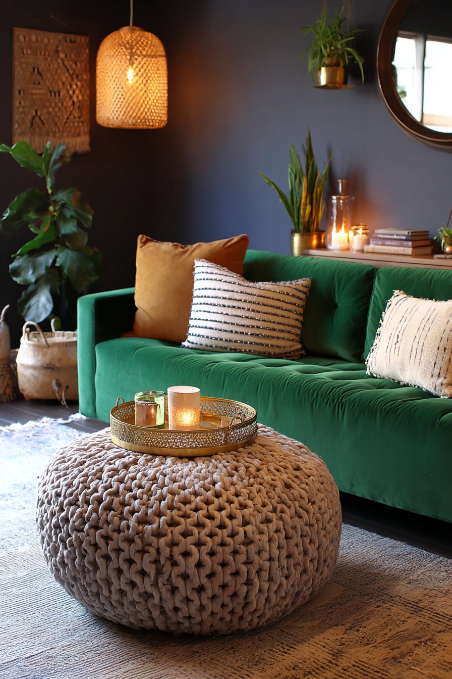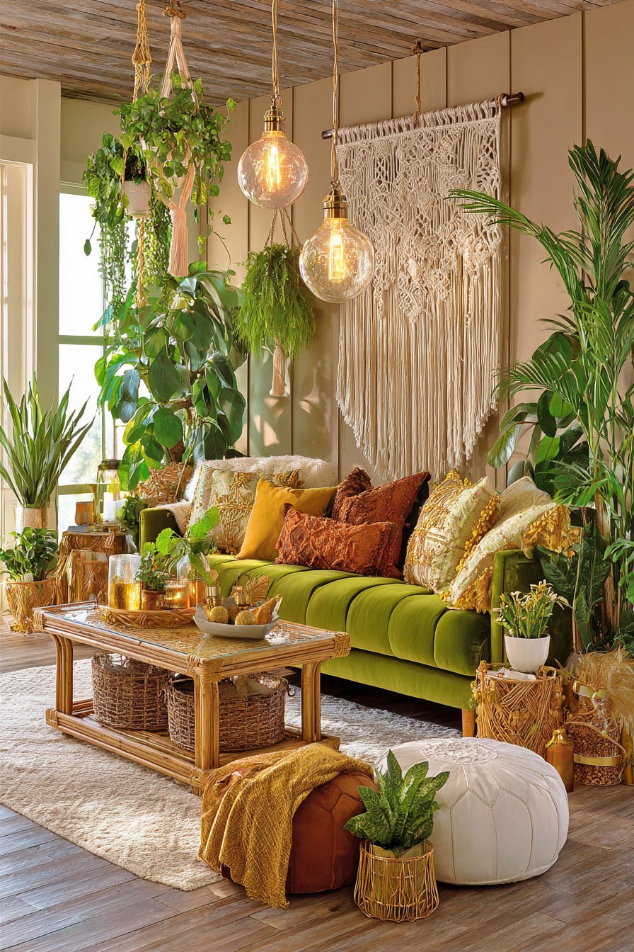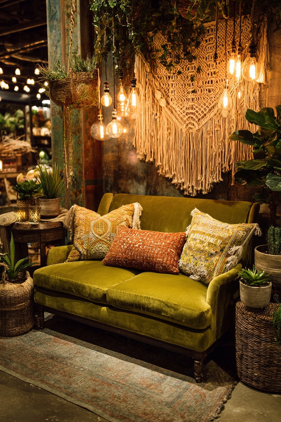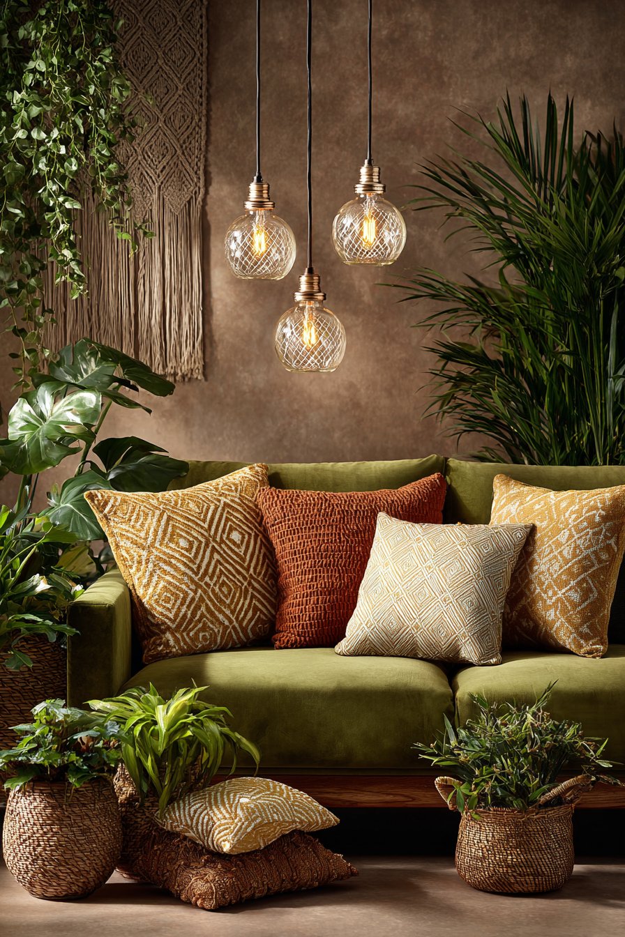 Macrame wall hangings suspended above the sofa demonstrate the bohemian appreciation for handcrafted items and artisanal techniques. These textile arts add vertical interest while their cream or natural fiber colors complement without competing with the busy pillow arrangement below. Layered textiles throughout the space—perhaps a vintage kilim draped over the sofa’s arm, a chunky knit throw folded nearby, woven wall hangings at various heights—create the sense of abundance and comfort central to bohemian aesthetics.