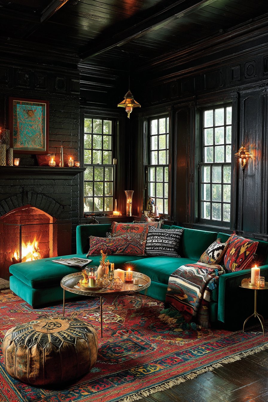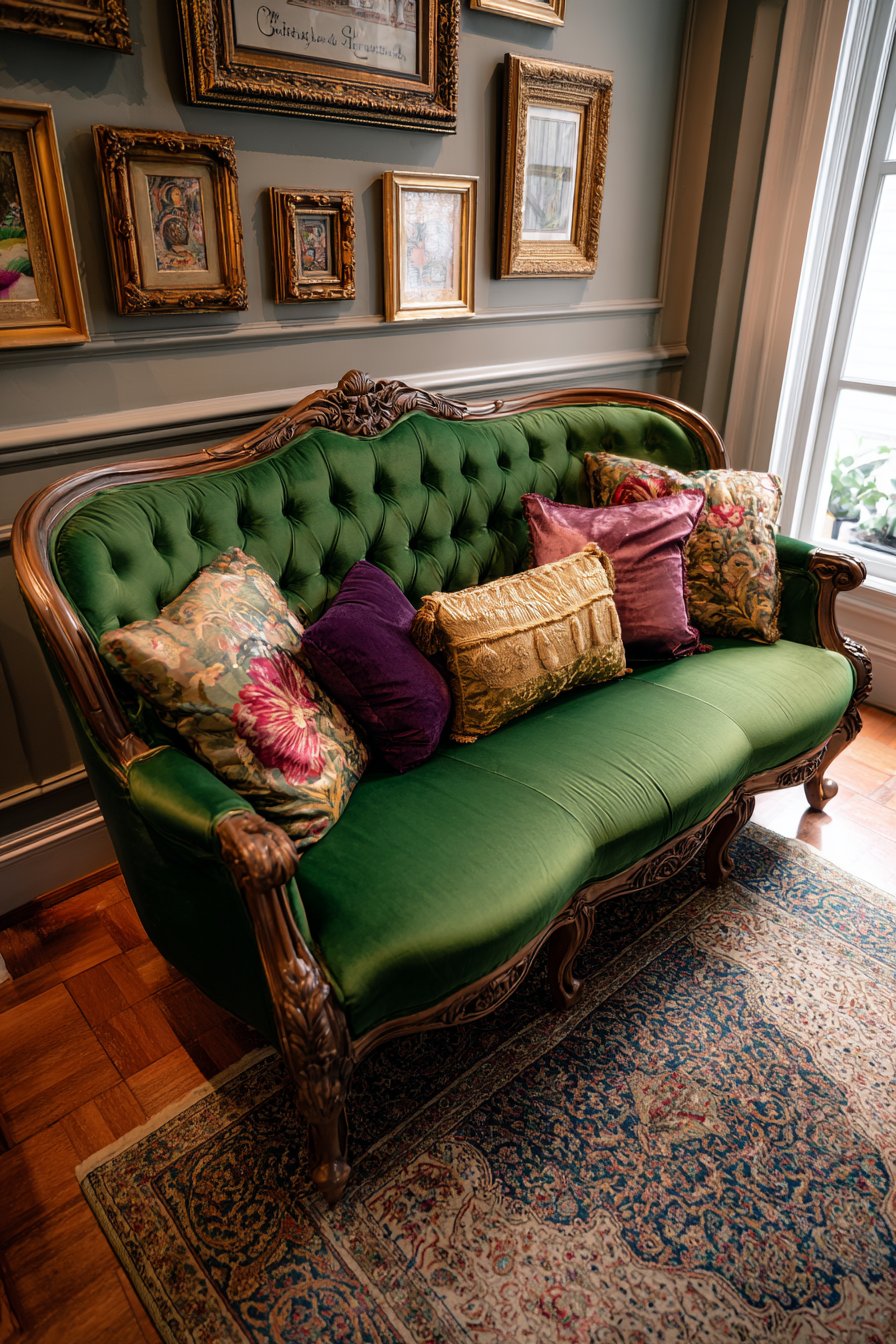 Maximalism celebrates abundance, pattern, color, and the philosophy that more is more. An emerald green velvet sofa with ornate carved wooden legs and decorative trim serves as the throne in this opulent space, its jewel-toned richness demanding attention and admiration. The velvet pile catches light dramatically, appearing to shift from deep forest to brilliant emerald depending on viewing angle and illumination. This isn’t furniture that fades into the background—it’s a statement piece that announces the room’s maximalist intentions.