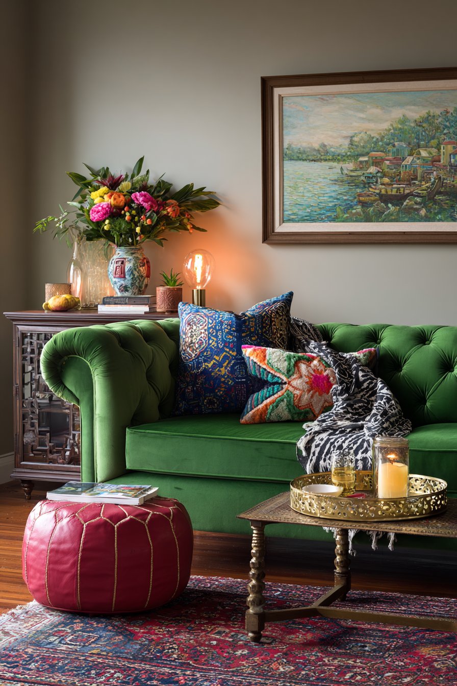 Eclectic design celebrates personal style by artfully combining elements from different periods, cultures, and aesthetics into cohesive, characterful spaces. A peacock green velvet sofa anchors this global-inspired room, its rich blue-green hue providing the foundation for layers of cultural influences. The velvet’s luxurious texture and jewel-tone color can accommodate the Moroccan pouf’s intricate embroidery, the Indian block-print pillow’s complex patterns, and the African mudcloth throw’s geometric designs without any single element overwhelming the others.