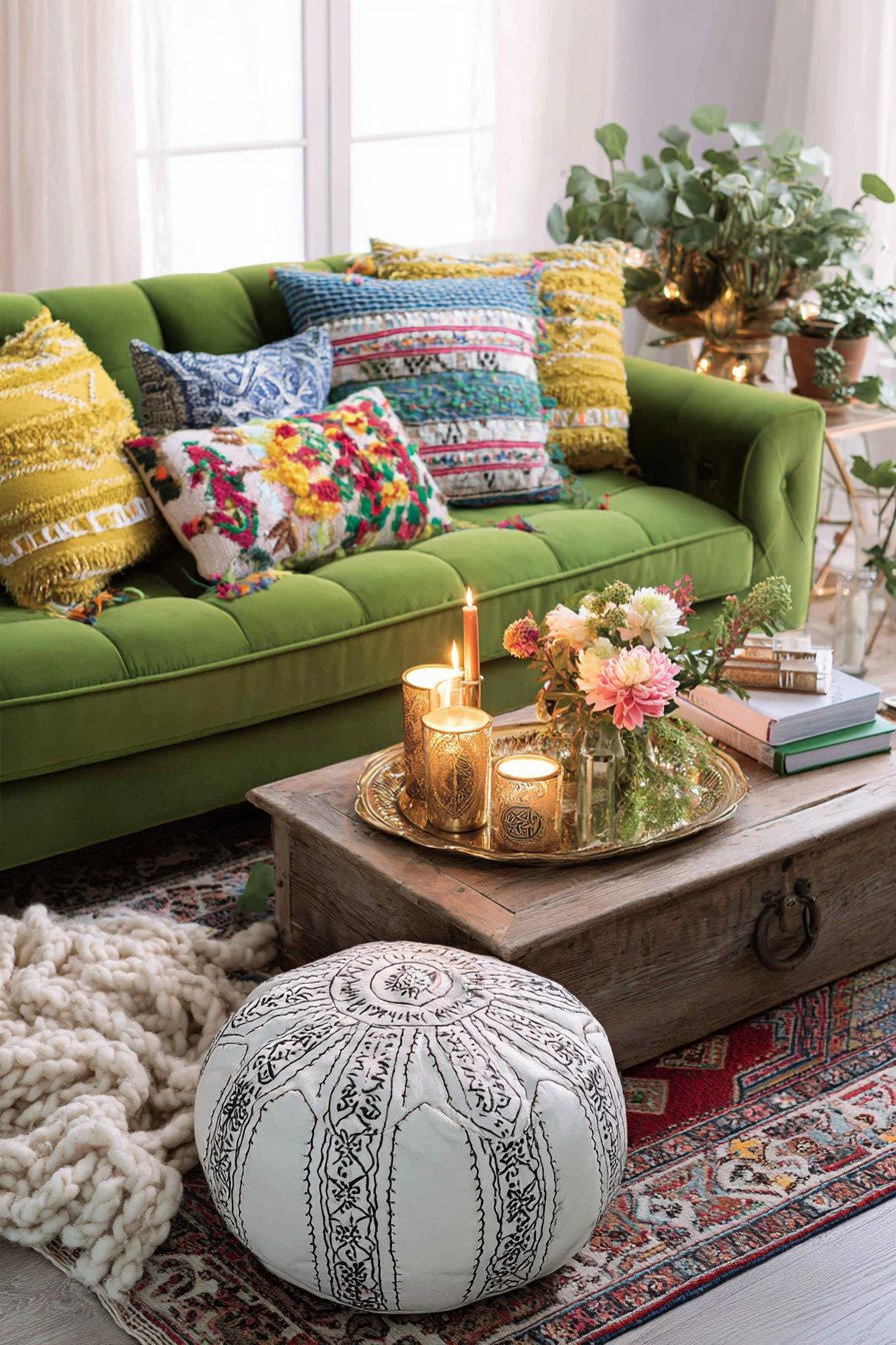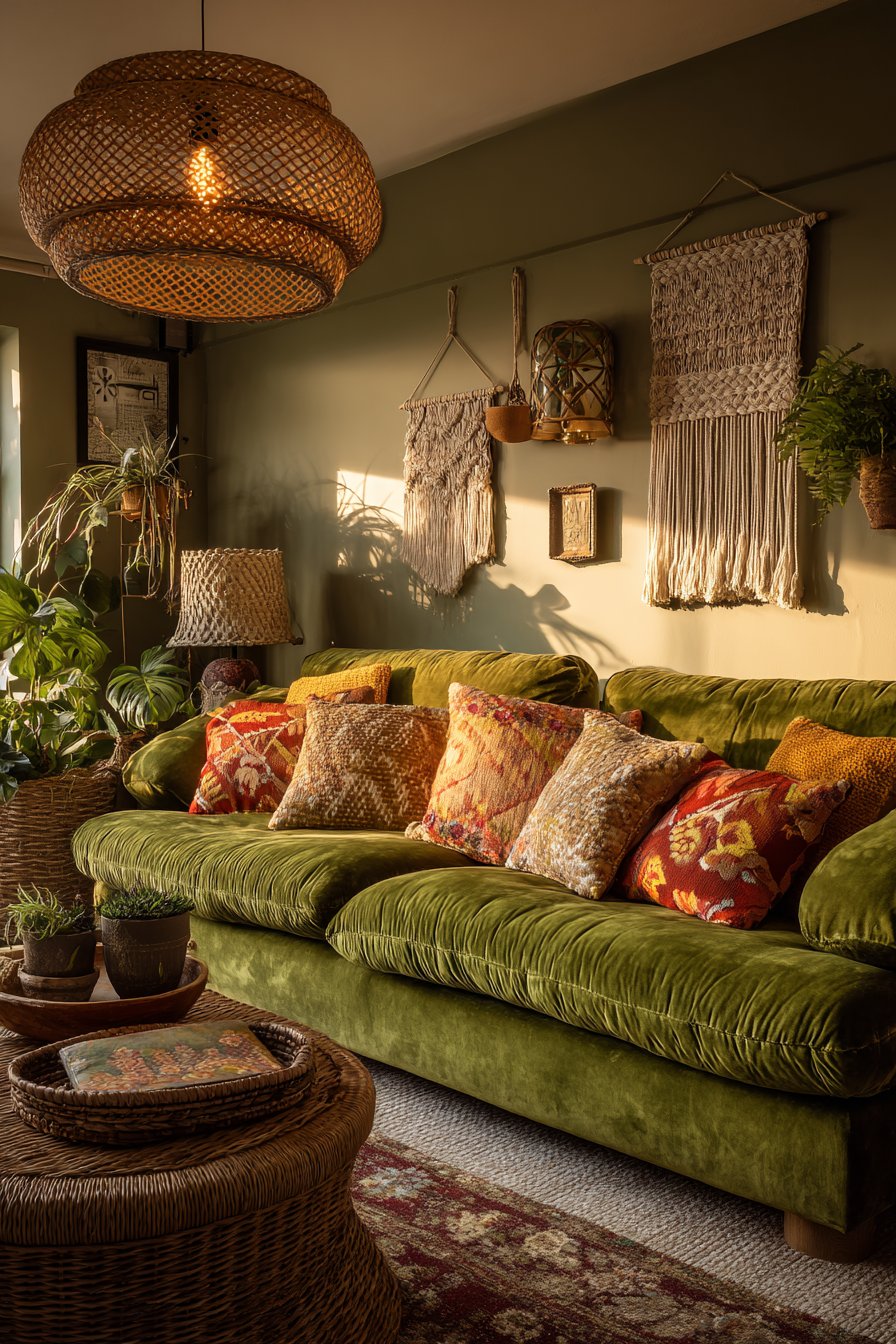 A bohemian living room centered around an olive green velvet sofa celebrates individuality, collected treasures, and the beauty of imperfection. This design philosophy rejects matching sets and coordinated collections in favor of pieces gathered over time, each with its own story and character. The olive green provides an earthy foundation that can accommodate the riot of colors, patterns, and textures characteristic of bohemian style. Adorned with an eclectic mix of throw pillows in terracotta, mustard, and cream, the sofa becomes a canvas for personal expression and creative combination.