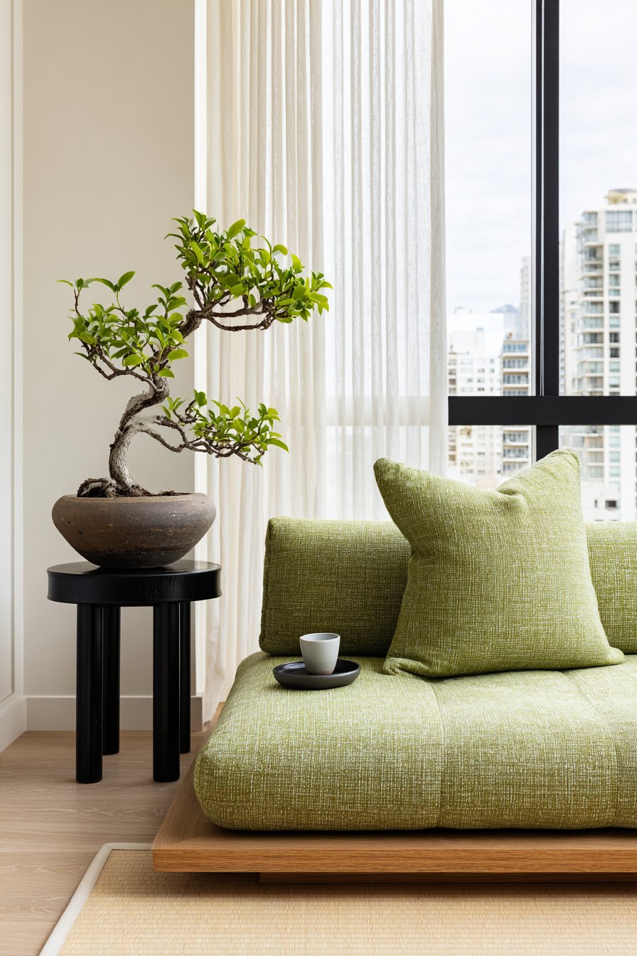 White walls and minimal window treatment allow natural light to become the primary design element, changing throughout the day and seasons to create ever-shifting conditions within the space. A small black lacquer side table holds a single ceramic cup—perhaps for tea ceremony or simply daily enjoyment—its glossy surface and precise edges contrasting with the organic textures elsewhere. This is a space designed for presence and awareness, where the celadon green sofa provides comfortable seating for meditation, reading, or simply being still in a busy world.