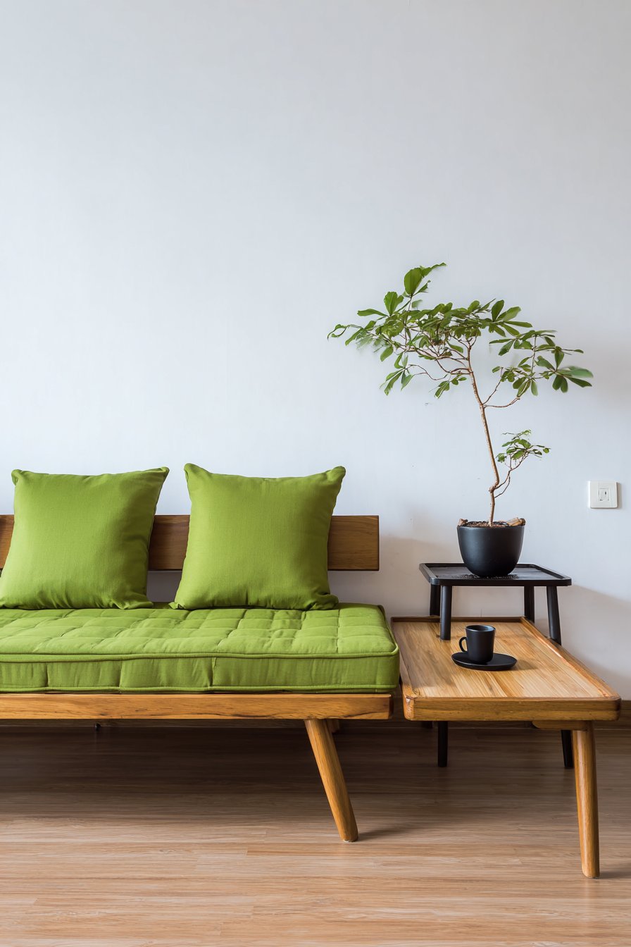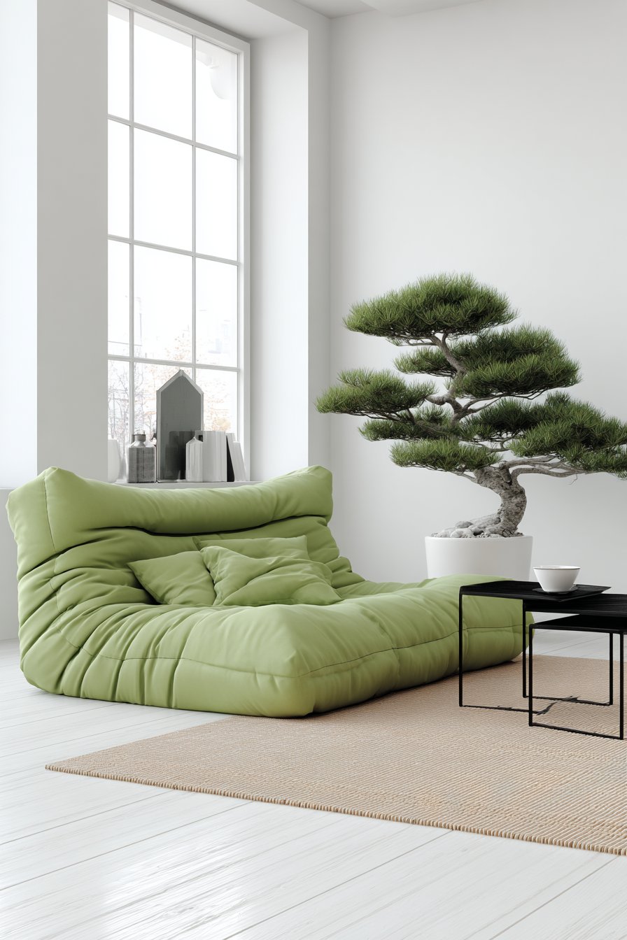Japanese-inspired minimalism emphasizes simplicity, tranquility, and mindful appreciation of negative space—principles beautifully realized in a living room featuring a celadon green sofa with low profile and simple lines. The celadon hue references traditional Japanese ceramics, its soft grey-green color promoting calm and contemplation. The low profile keeps the visual center of gravity near the floor, creating stability and grounding while the simple lines reject any unnecessary ornamentation or decoration.