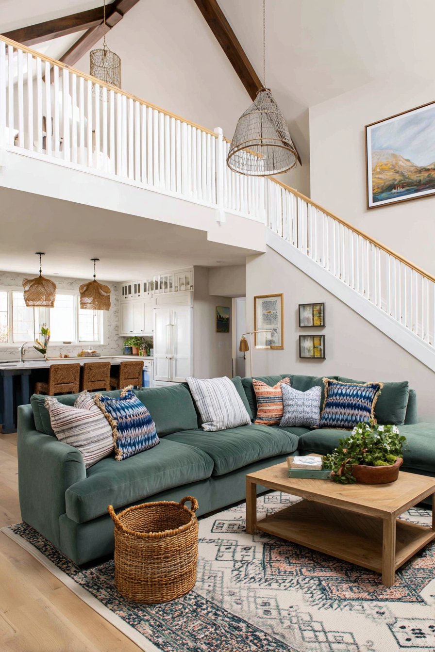 Pendant lighting suspended above the sectional marks the living space boundary from above while providing necessary illumination for reading or conversation. The pendant’s position and style can reinforce the living area’s definition while contributing to the overall design aesthetic—perhaps a modern geometric pendant for contemporary spaces or a woven natural fiber pendant for organic, casual interiors. The pistachio green sectional demonstrates how thoughtful furniture selection and placement can create functional zones in open spaces while maintaining the flow and connection that makes open concept living appealing.