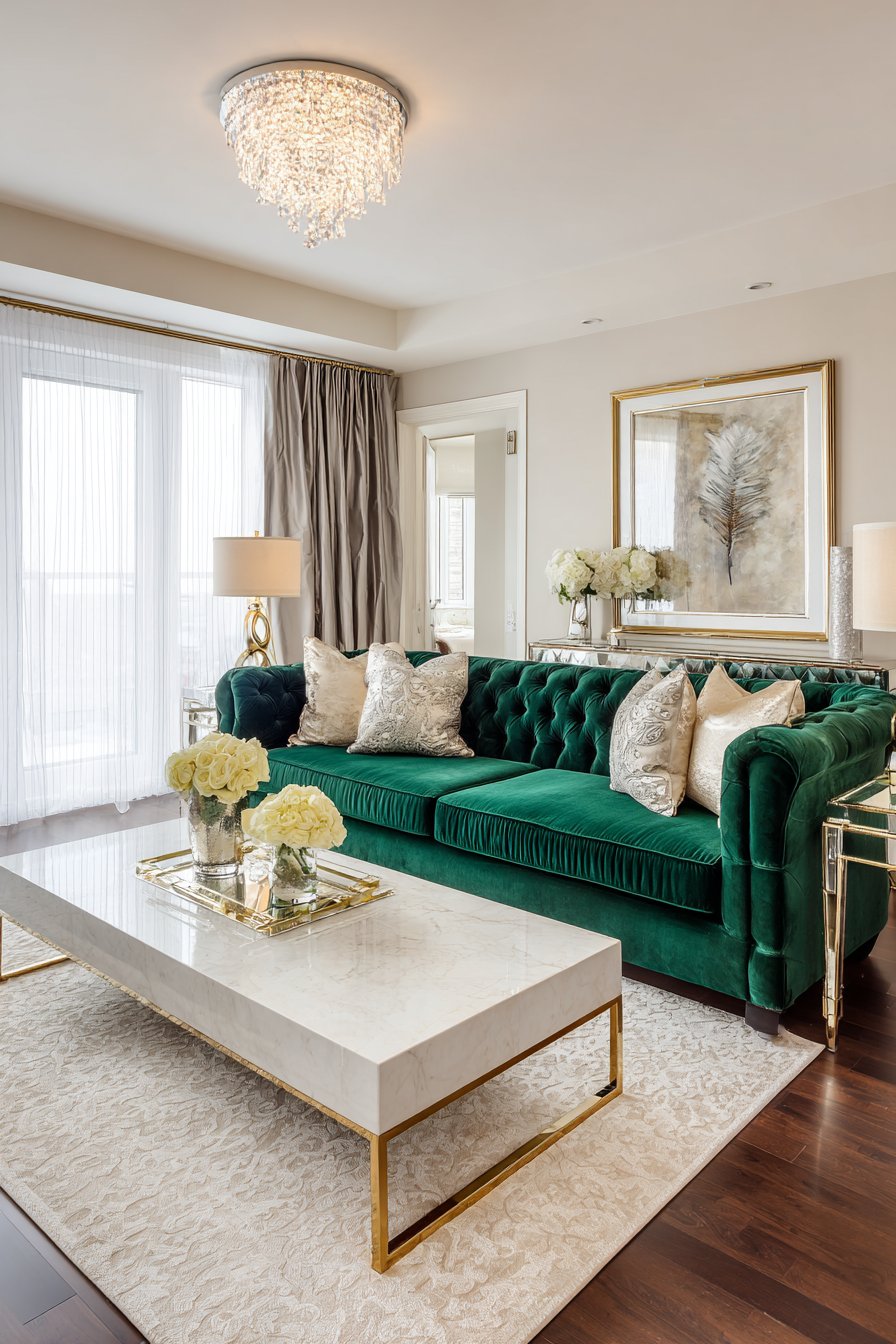 A crystal chandelier overhead provides both illumination and jewelry for the room, its prismatic elements scattering rainbow light across surfaces and creating sparkle that animates the space. A mirrored accent table reflects and multiplies light while adding another layer of glamour through its reflective surfaces. Plush cream area rug and floor-to-ceiling drapery in dove grey silk complete the elegant scene, their luxurious materials and expert installation communicating that this is a space where quality matters above all else. The emerald green sofa serves as the jewel in this carefully composed setting, its rich color and sumptuous texture making it the natural focal point.