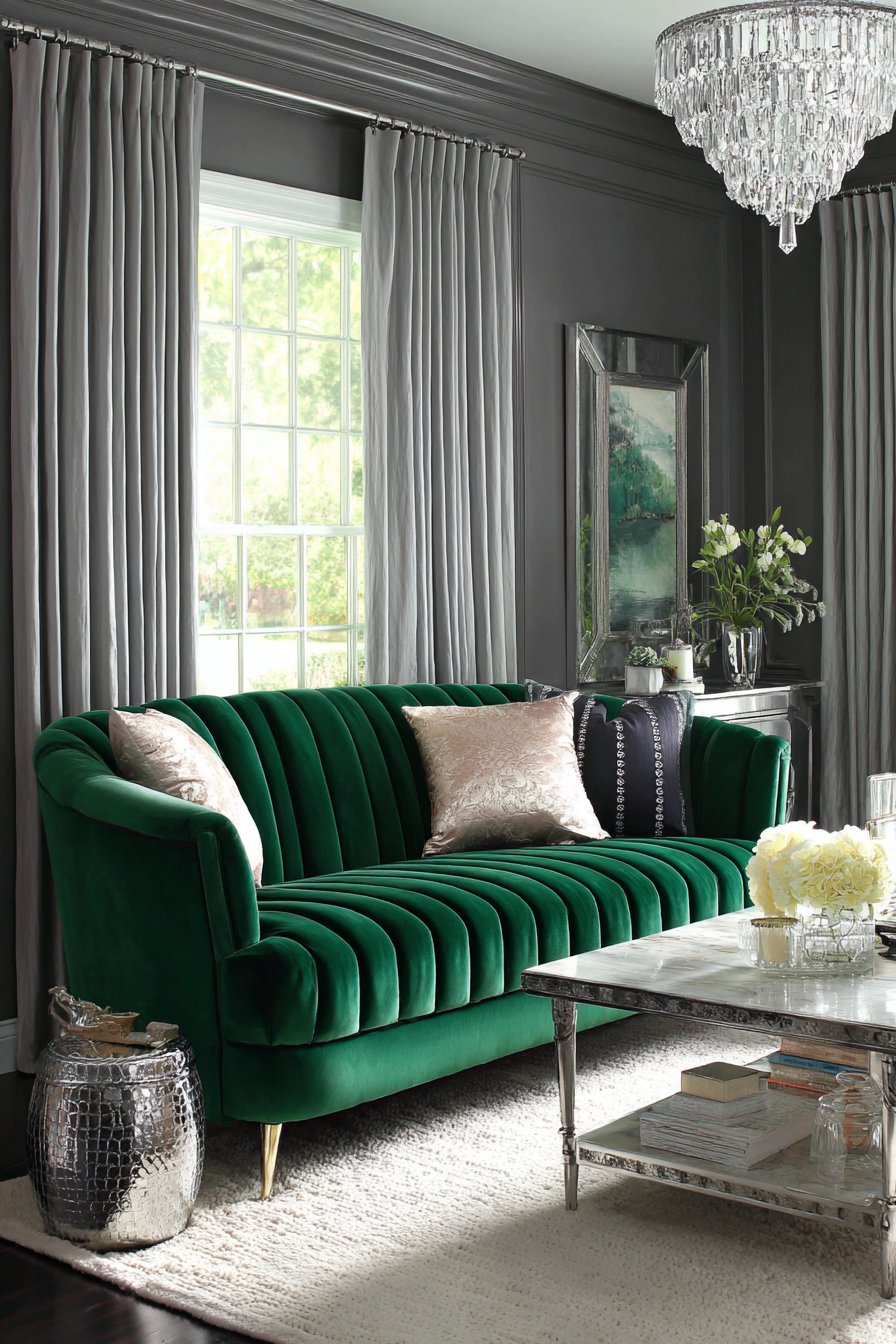 Luxury design celebrates quality materials, meticulous craftsmanship, and unapologetic elegance—principles magnificently embodied in an emerald green velvet sofa with gold-finished metal legs and channel tufting details. The channel tufting creates vertical linear patterns across the seat and back, adding sophisticated texture while showcasing the velvet’s light-catching properties. The gold-finished metal legs provide subtle contrast and a touch of glamour, elevating the piece from simply beautiful to genuinely luxurious.