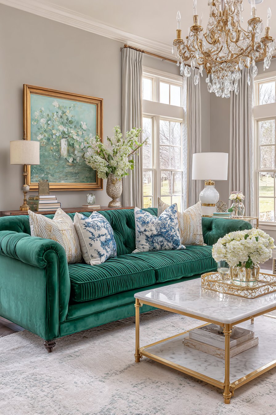 Key Design Tips: Balance every traditional element with a contemporary counterpart to maintain equilibrium. Invest in classic furniture shapes in updated colors or materials rather than trendy silhouettes. Choose quality over quantity—fewer, better pieces in transitional spaces. Mix metal finishes thoughtfully, perhaps using brass and chrome together rather than matching everything. Maintain a cohesive color palette that allows traditional and contemporary elements to coexist harmoniously, using the green sofa as the anchor that ties everything together.