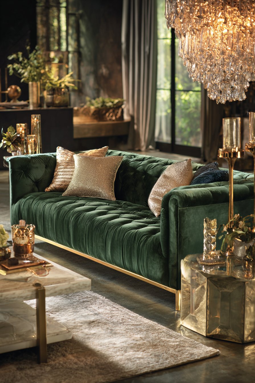 A tiered brass chandelier provides illumination while serving as sculptural centerpiece, its geometric form and metallic finish embodying Art Deco principles. The lighting it casts creates drama and shadow, highlighting the emerald velvet’s depth while the gold accents throughout catch and reflect light to create constant sparkle. This is a space designed for entertaining, for cocktail parties and elegant gatherings, for living with style and panache. The emerald green sofa commands attention as the jewel in this carefully orchestrated theatrical setting.