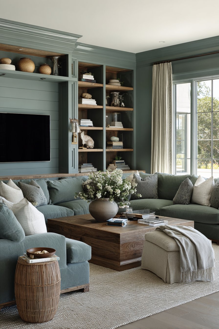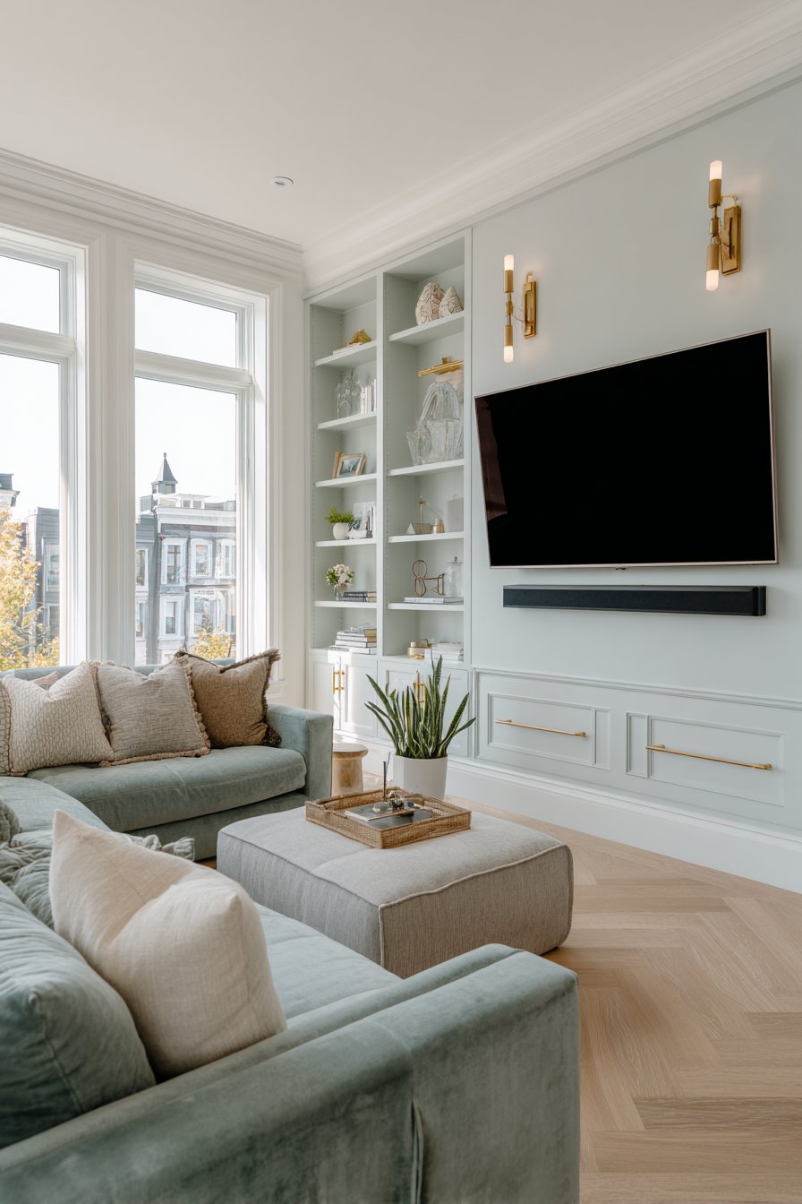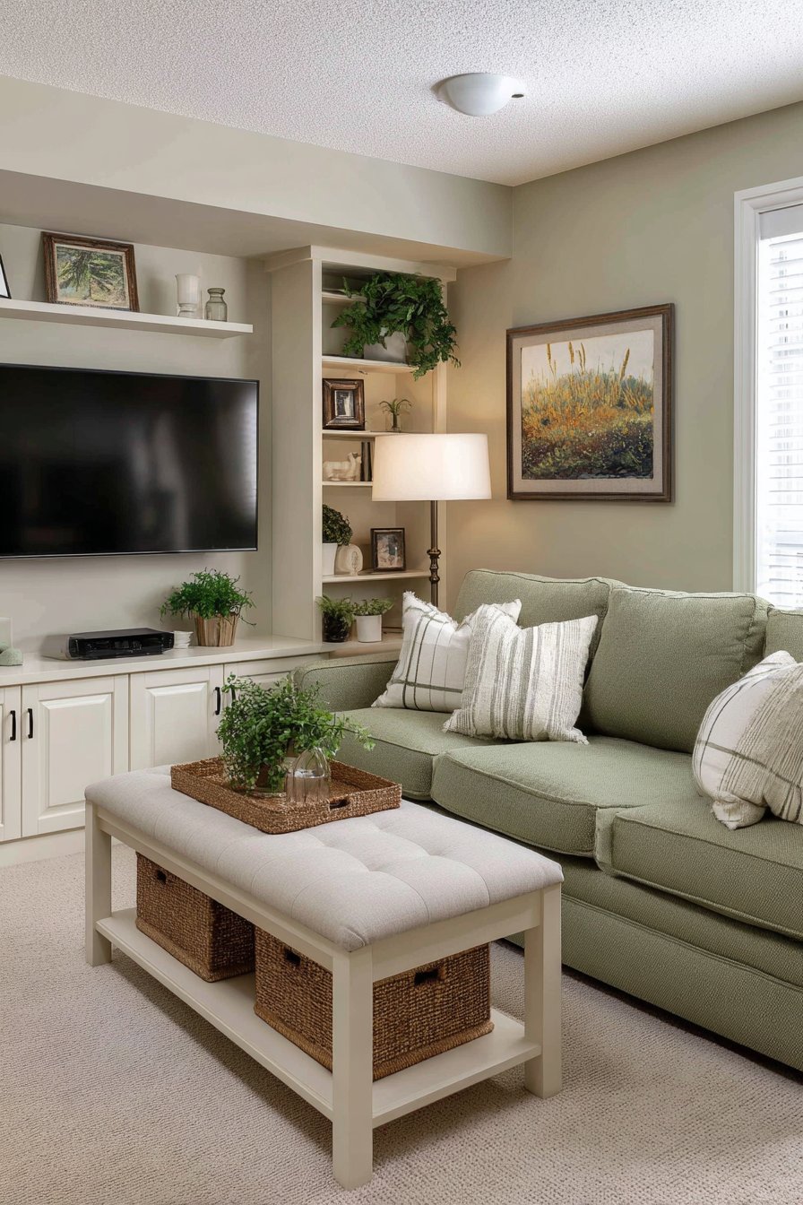 Key Design Tips: Choose furniture with integrated storage to maximize space efficiency without adding more pieces. Incorporate both open and closed storage to balance display with concealment. Invest in cable management solutions to keep technology cords organized and hidden. Build in storage whenever possible for the most seamless, space-efficient solutions. Select an ottoman that can serve multiple purposes—seating, footrest, coffee table, storage. Maintain consistent style between furniture and built-ins for cohesive appearance. Choose a calming sofa color like sage green that won’t compete with the organized systems but will provide sophisticated anchor.