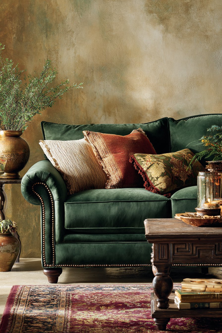 Step into a living room where luxury meets comfort, anchored by a sumptuous forest green velvet sofa with rolled arms and gleaming nailhead trim. This isn’t just furniture—it’s a statement of refined taste and appreciation for quality craftsmanship. The deep, jewel-toned green of the velvet catches light in mesmerizing ways, appearing darker in shadows and luminous where light hits the pile of the fabric. The tactile experience of velvet adds a sensory dimension that elevates the entire room, inviting guests to sink into comfort while surrounded by beauty.