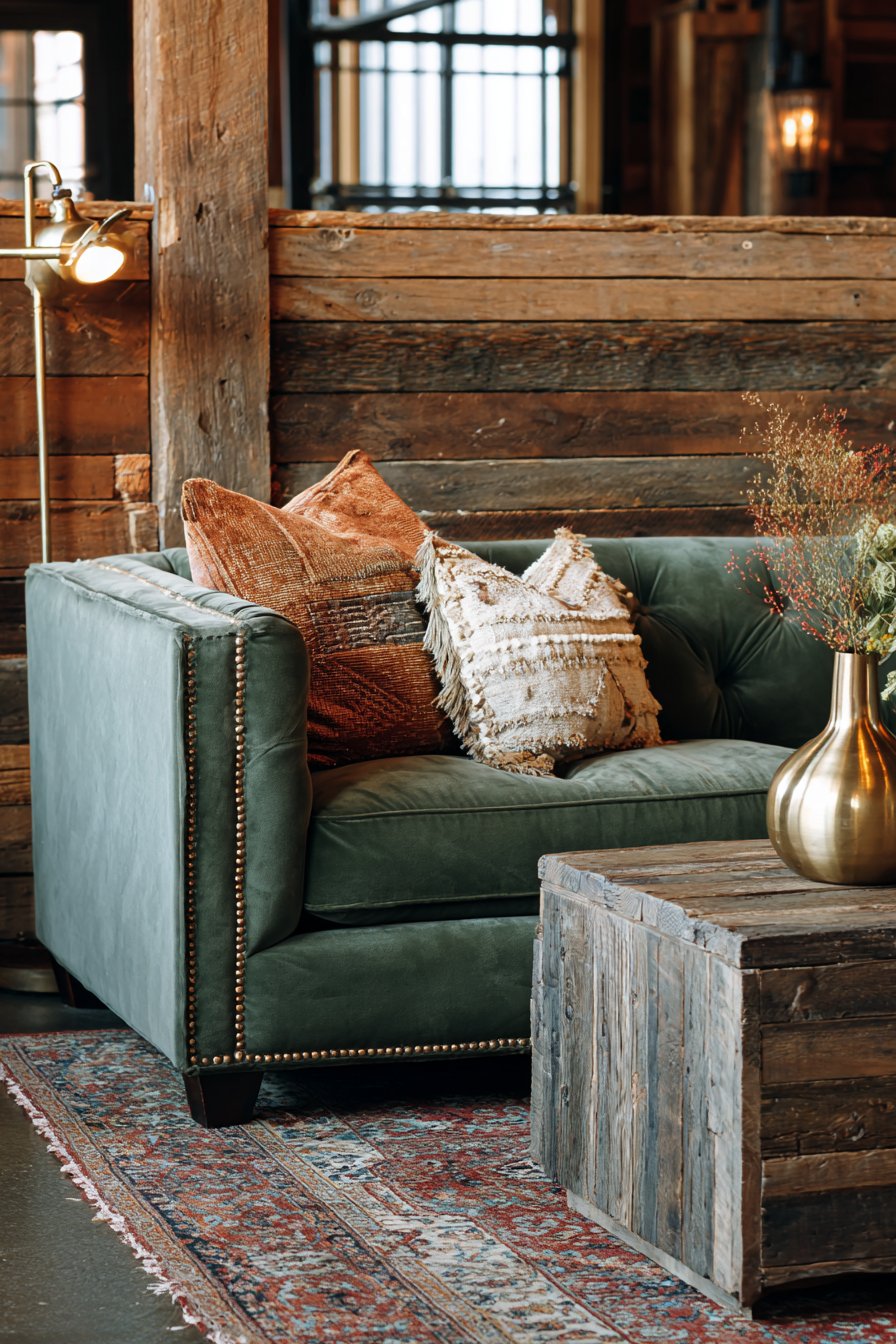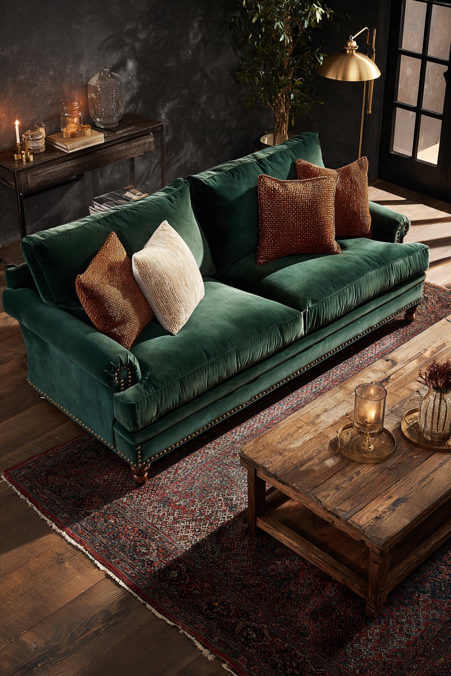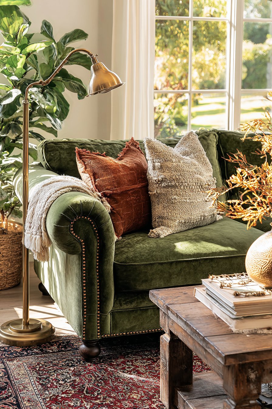 The styling of this sofa demonstrates sophisticated layering techniques. Textured throw pillows in rust, cream, and gold tones create visual interest while complementing the green’s natural warmth. A vintage-inspired brass floor lamp positioned beside the sofa provides both ambient and task lighting, its warm metallic finish echoing the gold accents scattered throughout the pillows. The reclaimed wood coffee table introduces organic texture and a sense of history, while its weathered finish contrasts beautifully with the velvet’s pristine surface.