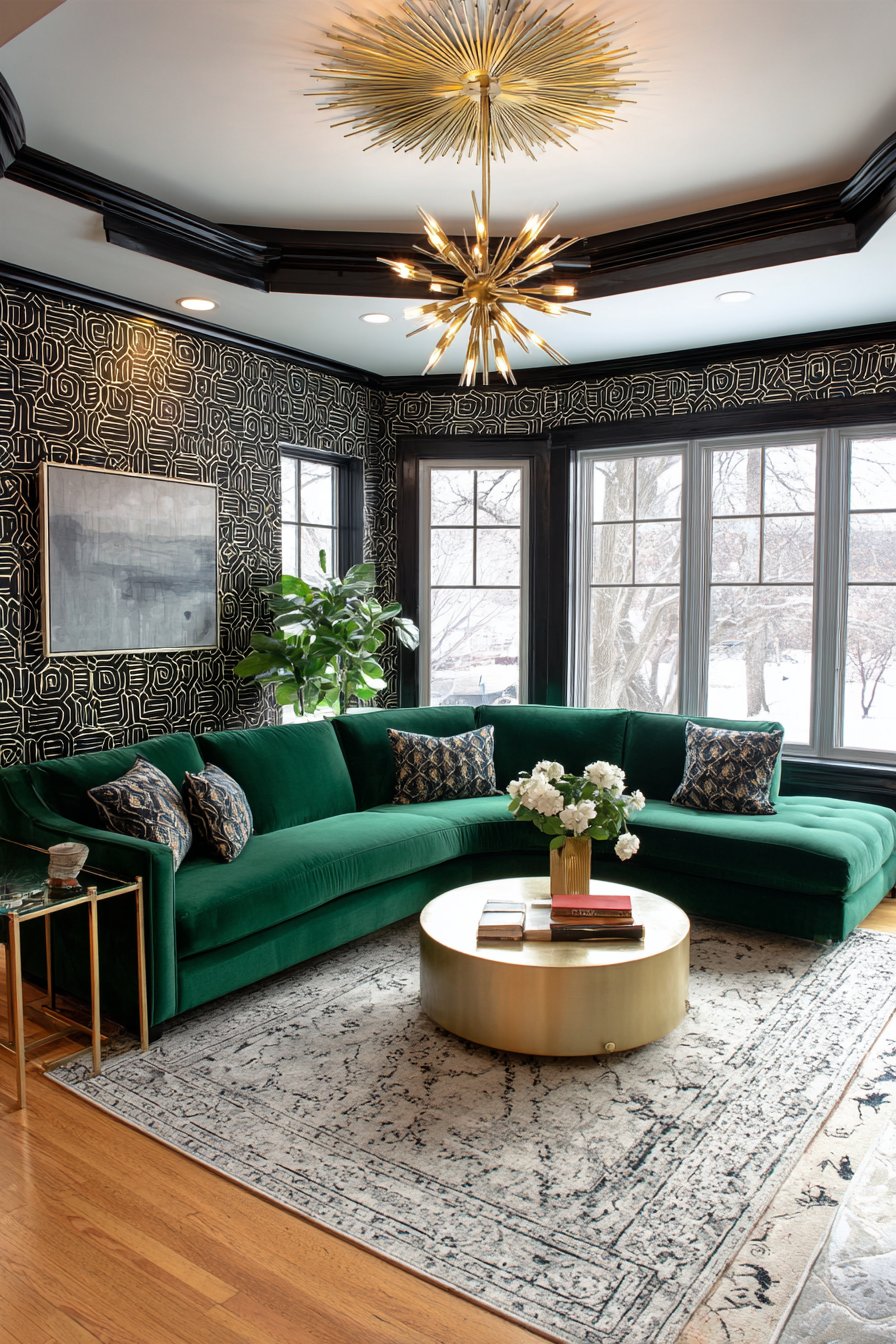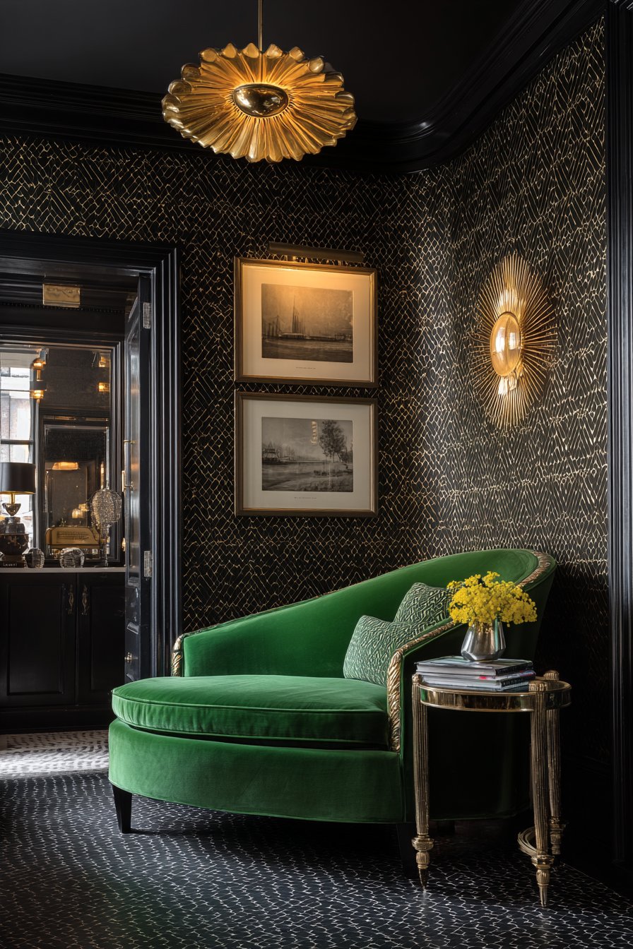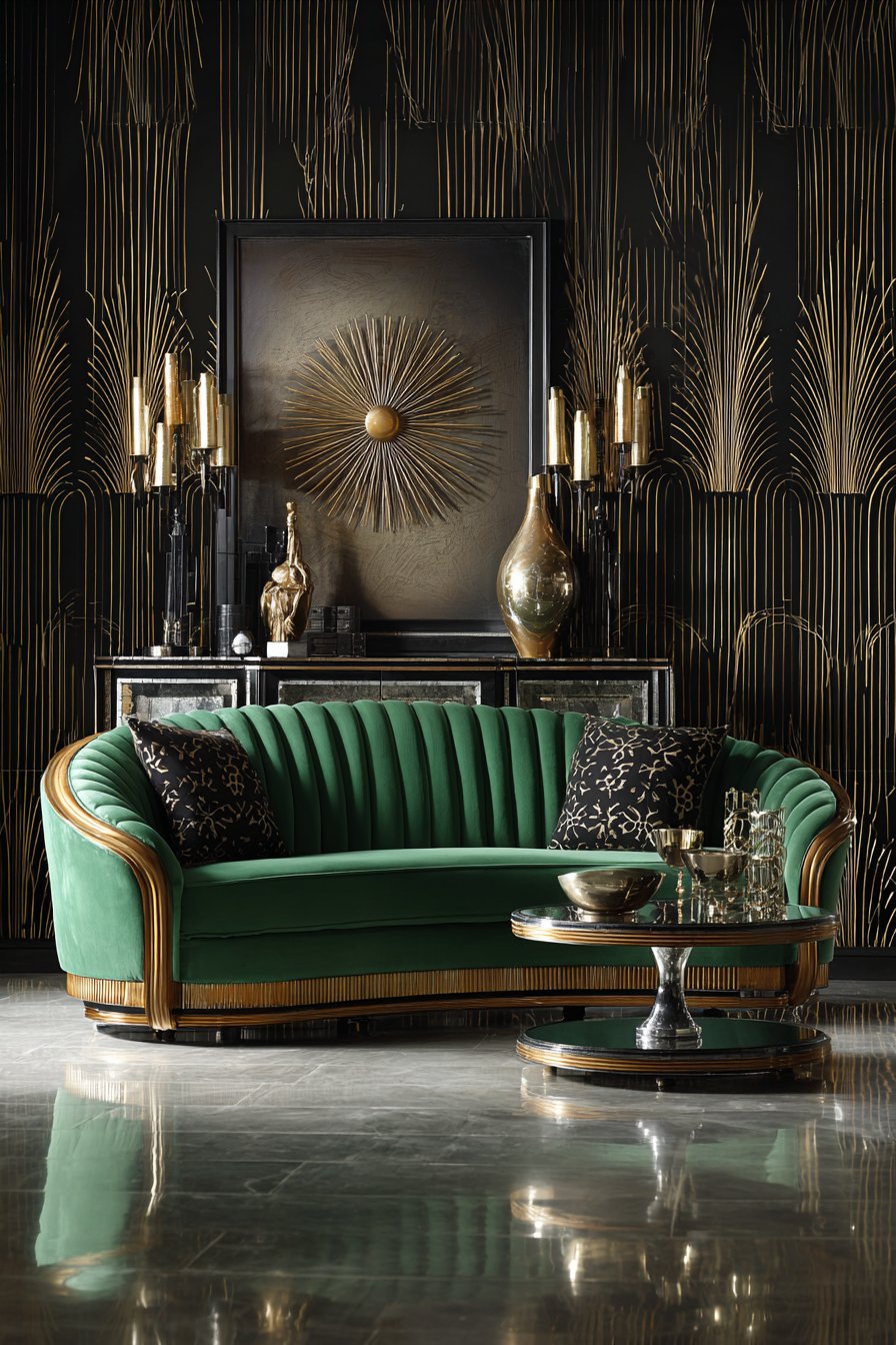 Geometric black and gold wallpaper creates a dramatic backdrop that would overwhelm lesser furniture but perfectly complements the emerald sofa’s theatrical presence. The pattern’s strong lines and metallic elements reference Art Deco’s love of geometric precision and glamorous materials. Mirrored side tables multiply light and space while adding another layer of sparkle and sophistication characteristic of the era. A sunburst mirror—an Art Deco icon—radiates on the wall, its geometric rays and metallic finish epitomizing the style’s optimistic, forward-looking character.