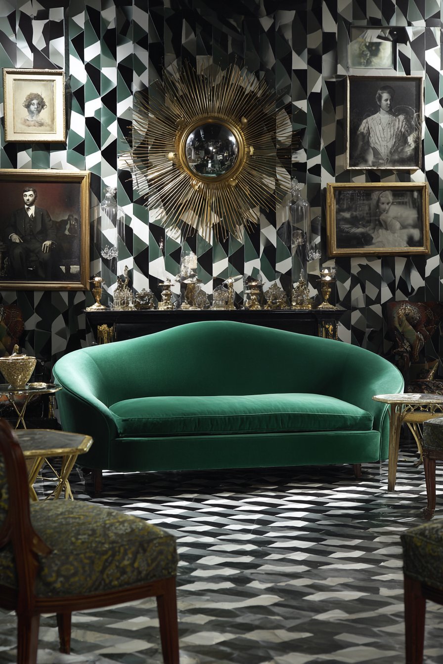 Art Deco design from the 1920s and 30s celebrates geometric forms, luxurious materials, and theatrical glamour—an aesthetic dramatically realized in a living room featuring an emerald green velvet sofa with curved silhouette and gold-leafed wooden accents. The curved form references the streamlined shapes characteristic of Art Deco furniture while the emerald velvet and gold leaf communicate the era’s love of luxury and spectacle. This isn’t furniture that fades into the background—it’s designed to be admired, to make statements, to create drama.