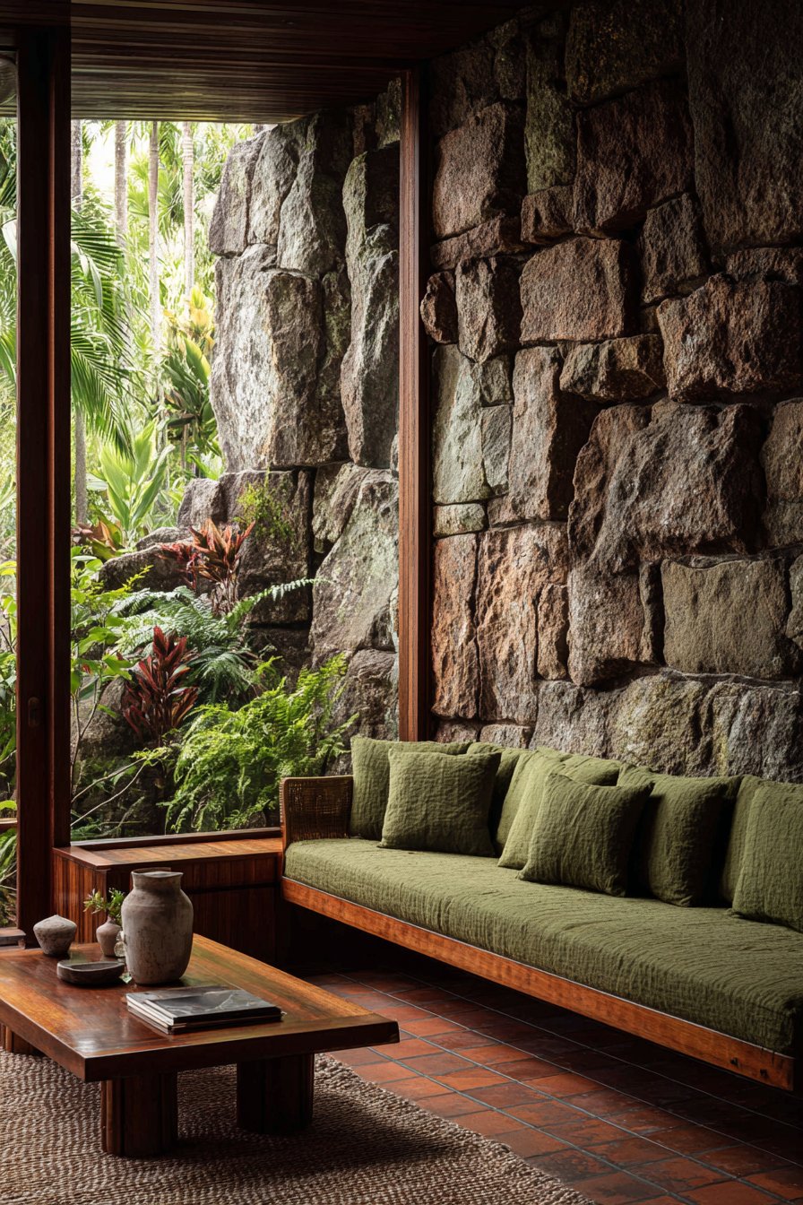 A stone accent wall creates dramatic textural interest while bringing literal earth elements indoors. Whether natural stacked stone, river rock, or cut stone veneer, the wall’s varied surfaces catch light differently throughout the day, creating ever-changing shadow patterns and visual interest. Terracotta floor tiles in warm clay tones continue the earth element theme while their natural color variations and slight imperfections communicate authentic material rather than manufactured uniformity.