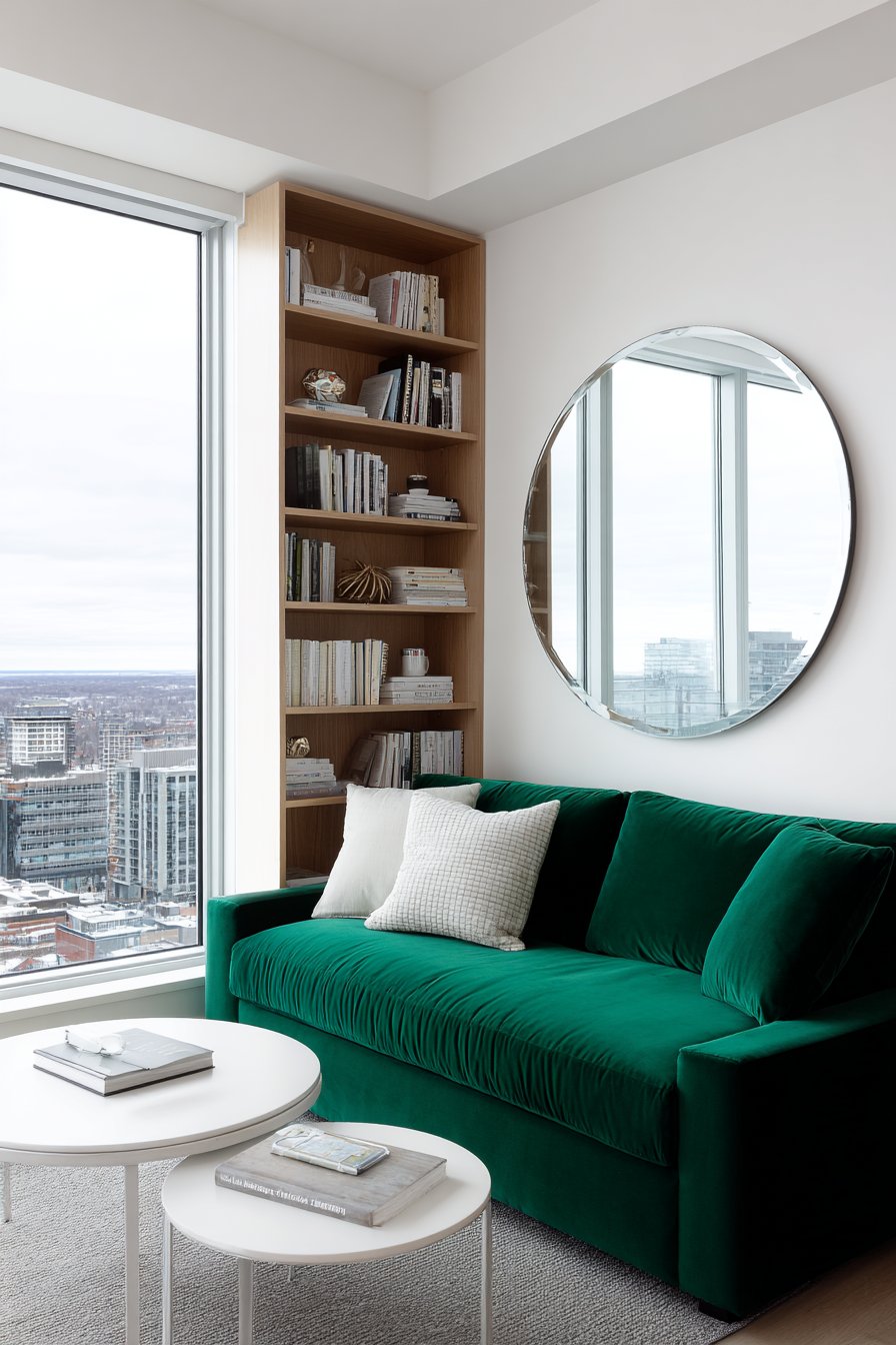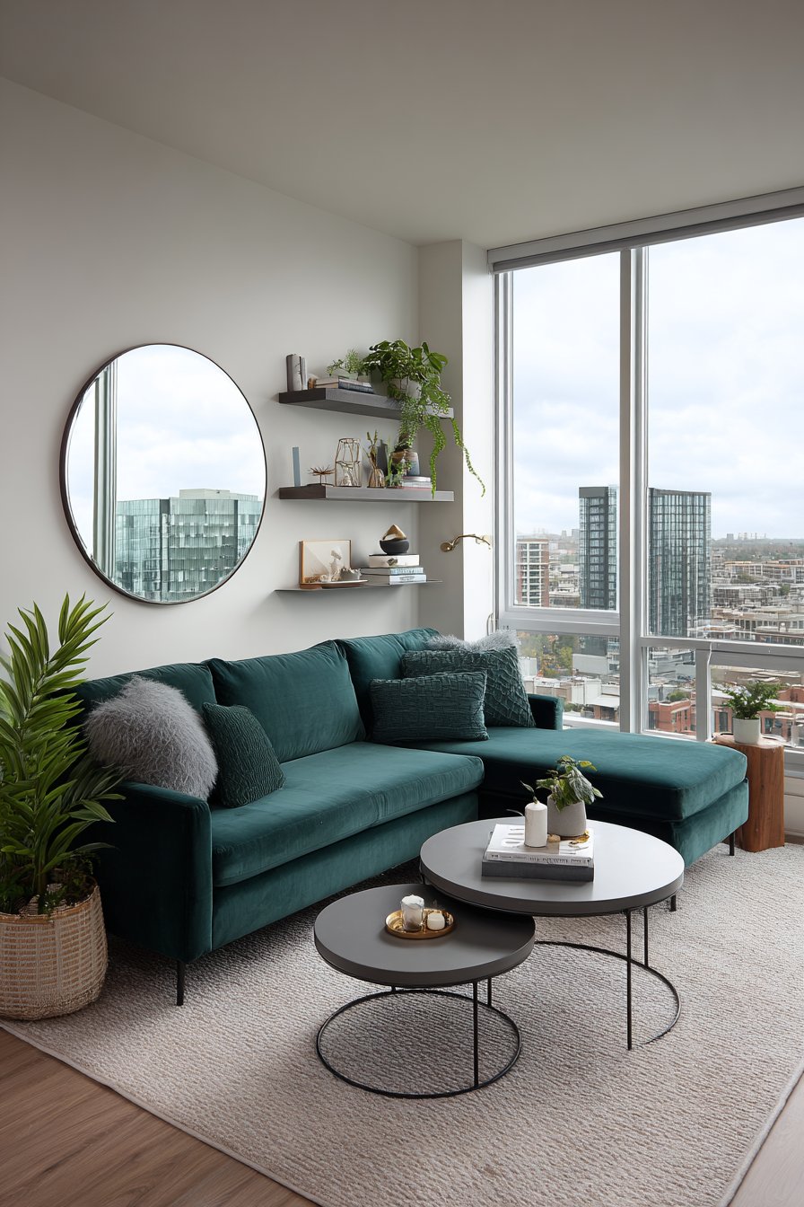 A small round coffee table and slim side table maintain the room’s functionality without creating the crowding that larger, bulkier furniture would cause. The round shape is particularly clever in small spaces, eliminating sharp corners that can impede movement while creating better flow patterns for foot traffic. A large mirror mounted on an adjacent wall performs double duty, reflecting natural light from the window to brighten the space while creating the illusion of expanded square footage—a classic design trick that works particularly well when the mirror reflects both the window and the handsome hunter green sofa.