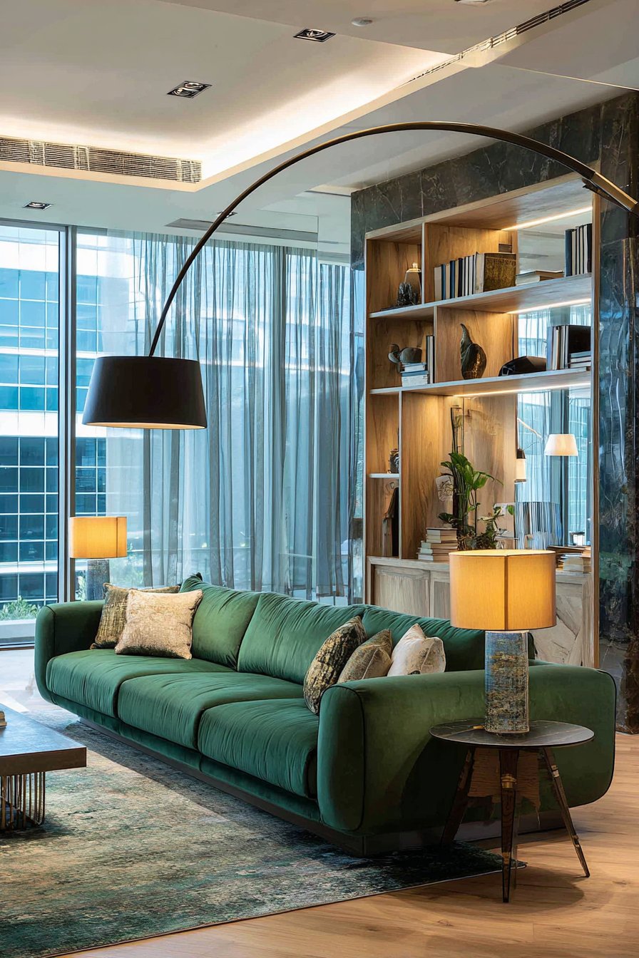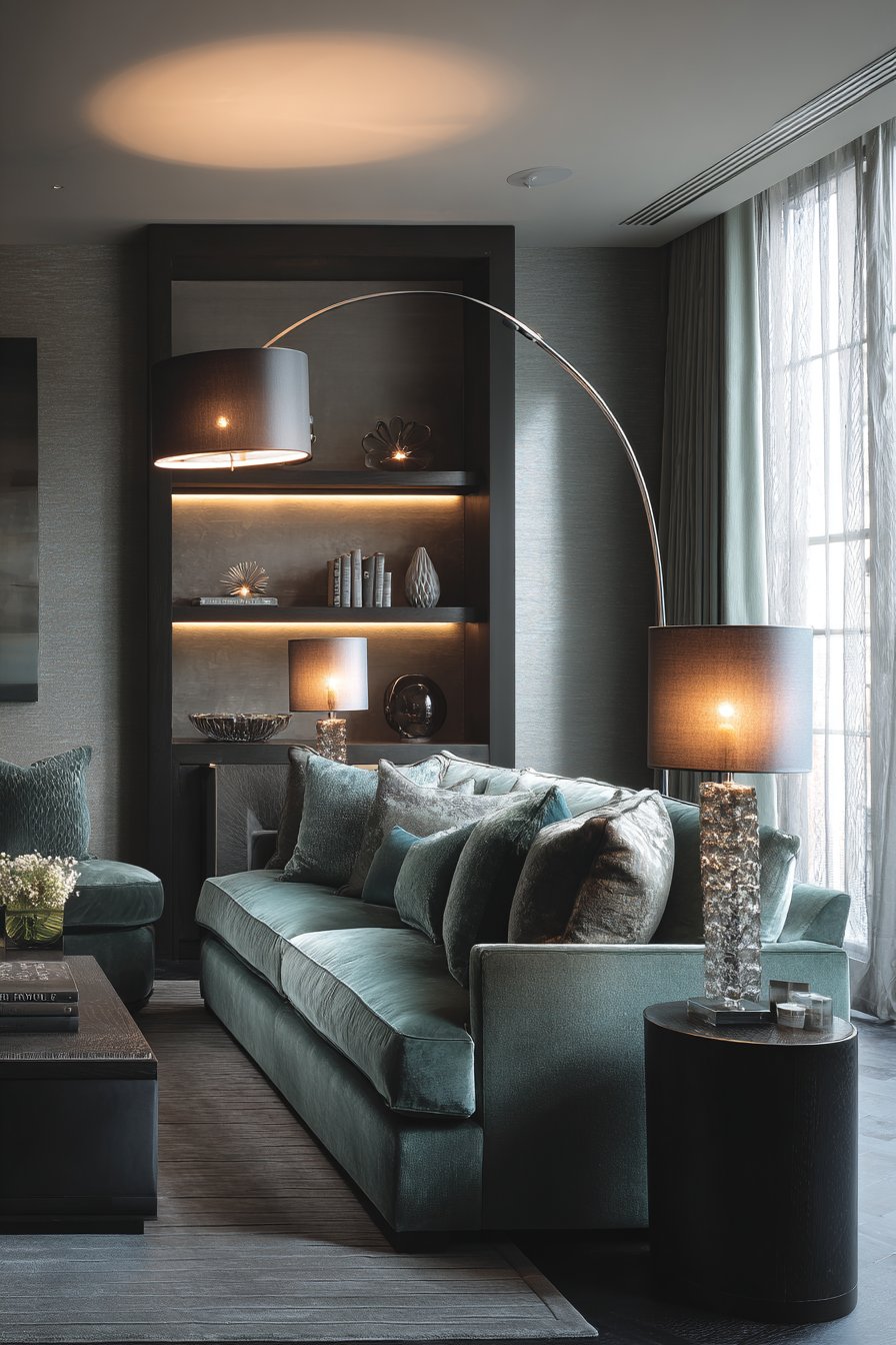 A dramatic arc floor lamp curves over the teal green sofa, providing task lighting ideal for reading or detailed work while making a sculptural statement. The arc form allows the light source to hover over the seating area without requiring side table placement, a space-efficient solution that also creates visual interest through its sweeping curve. Table lamps positioned on side consoles contribute additional task lighting while adding decorative presence at mid-level height, creating visual interest at human scale.
