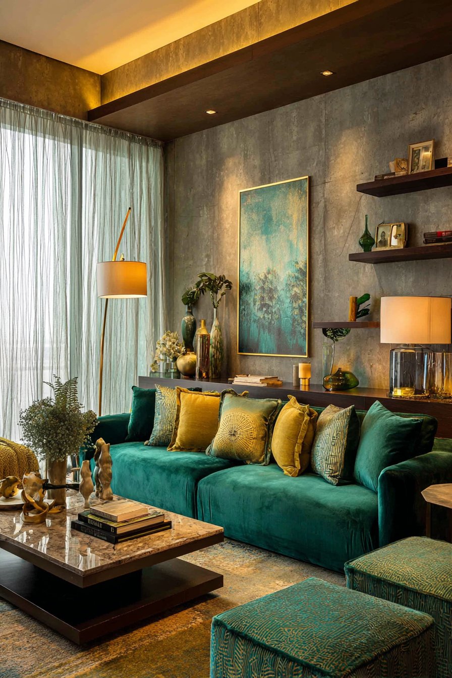 LED strip lighting concealed behind floating shelves creates subtle accent lighting that highlights displayed objects while adding depth and dimension to the walls. This indirect lighting technique adds sophistication and professional quality to the overall lighting scheme. Natural light from sheer-curtained windows balances all these artificial sources, its changing quality throughout the day creating varied lighting conditions that keep the space interesting and dynamic. The teal green sofa fabric responds differently to each light source—appearing more blue in cool light, more green in warm light—demonstrating how varied lighting creates visual interest through a single furniture piece.