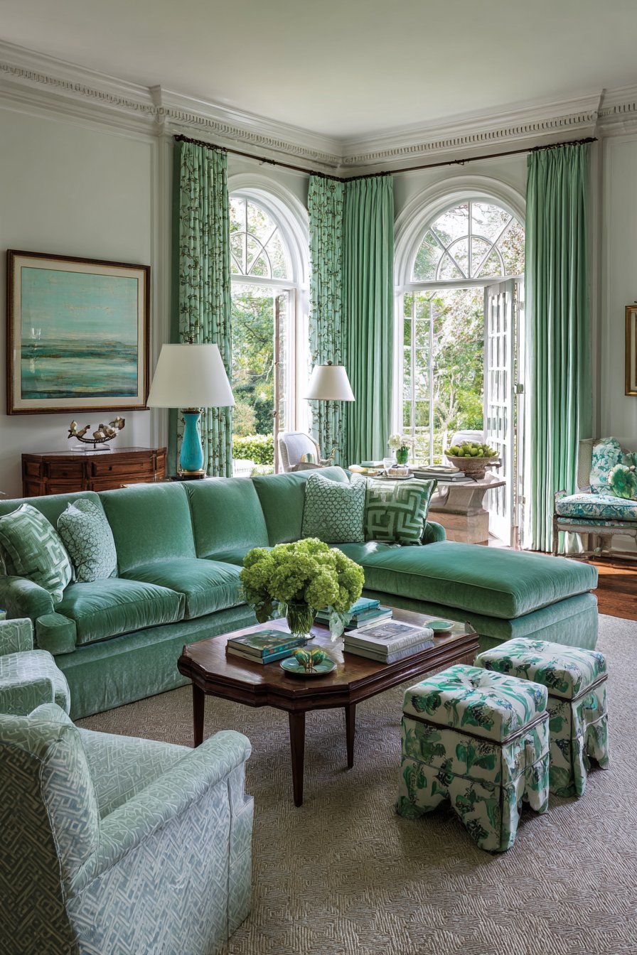 Monochromatic color schemes create sophisticated, cohesive spaces by using variations of a single color, achieving impact through tonal variation rather than contrasting colors. A kelly green velvet sofa serves as the saturated focal point in this verdant living room, its vibrant hue providing the pure, intense version of green that anchors the entire scheme. Surrounding elements in sage, mint, and forest green create tonal harmony while ensuring the space doesn’t read as monotonous or flat.