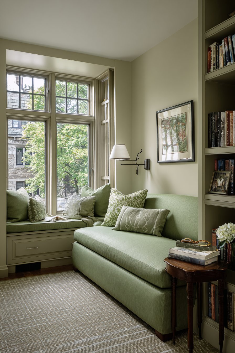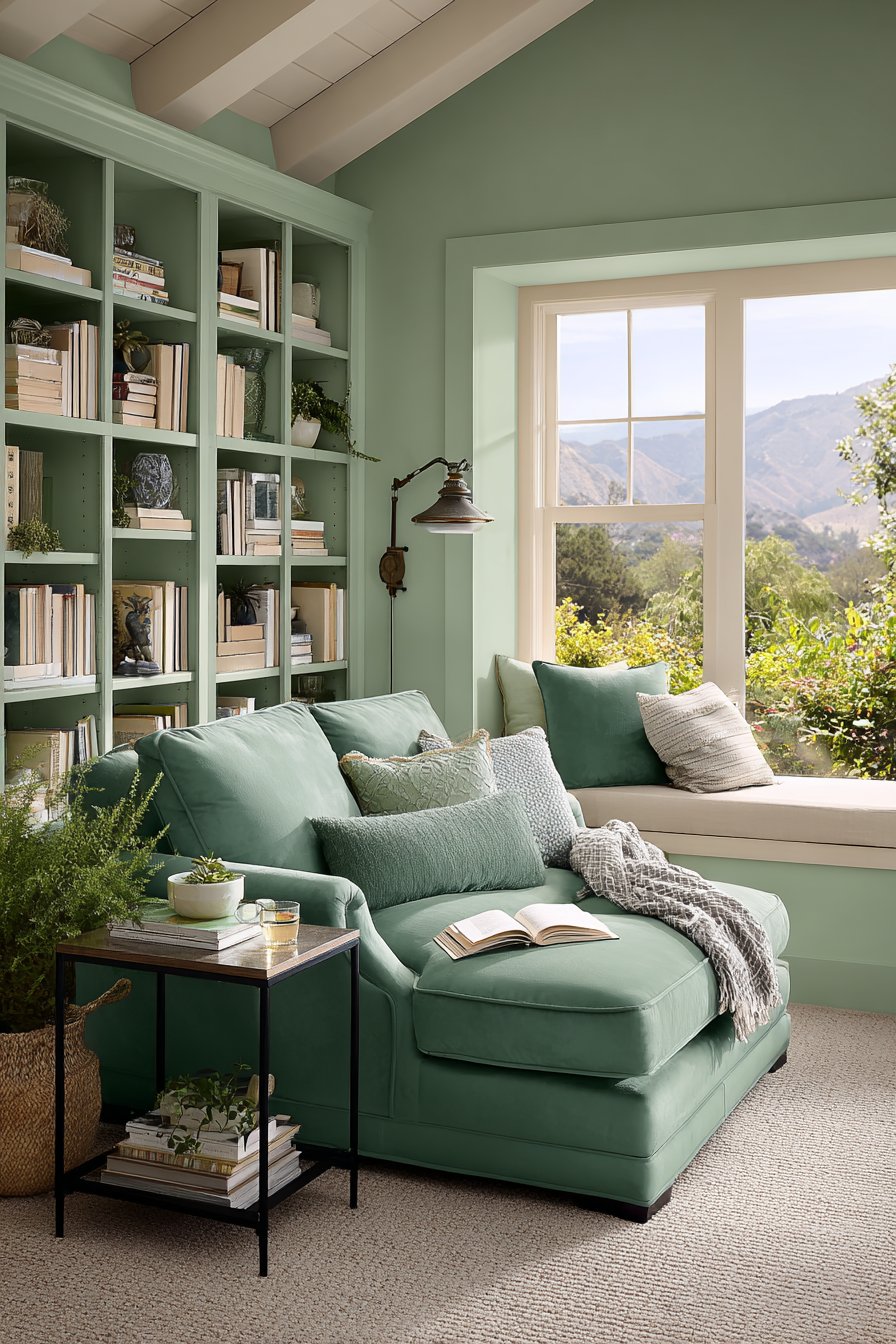 A small side table positioned within easy reach holds current reading material, reading glasses, perhaps a cup of tea or coffee, and a notebook for capturing thoughts or favorite passages. A window seat with coordinating seafoam green cushions extends the reading zone, providing alternative seating and natural light during daytime reading. The seafoam green sofa anchors this dedicated reading environment, its comfortable proportions and calming color making it the natural destination for settling in with a good book and losing track of time.
