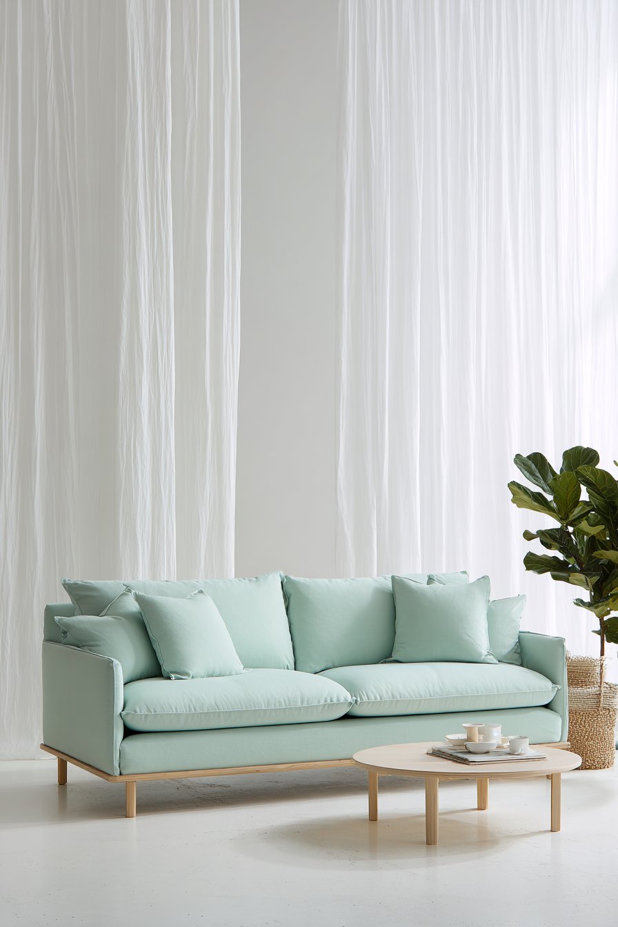 The Scandinavian approach to design celebrates simplicity, functionality, and connection to nature—principles perfectly embodied in a living room featuring a mint green fabric sofa with light birch legs. This isn’t the stark, cold minimalism some associate with Nordic design; rather, it’s a warm, inviting interpretation that uses subtle color and natural materials to create spaces that nurture well-being. The mint green hue is soft and soothing, reminiscent of early spring growth and new beginnings, while the birch legs connect the piece to Scandinavian forests and craftsmanship traditions.