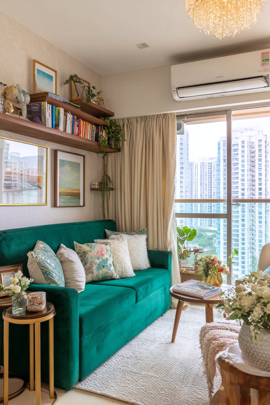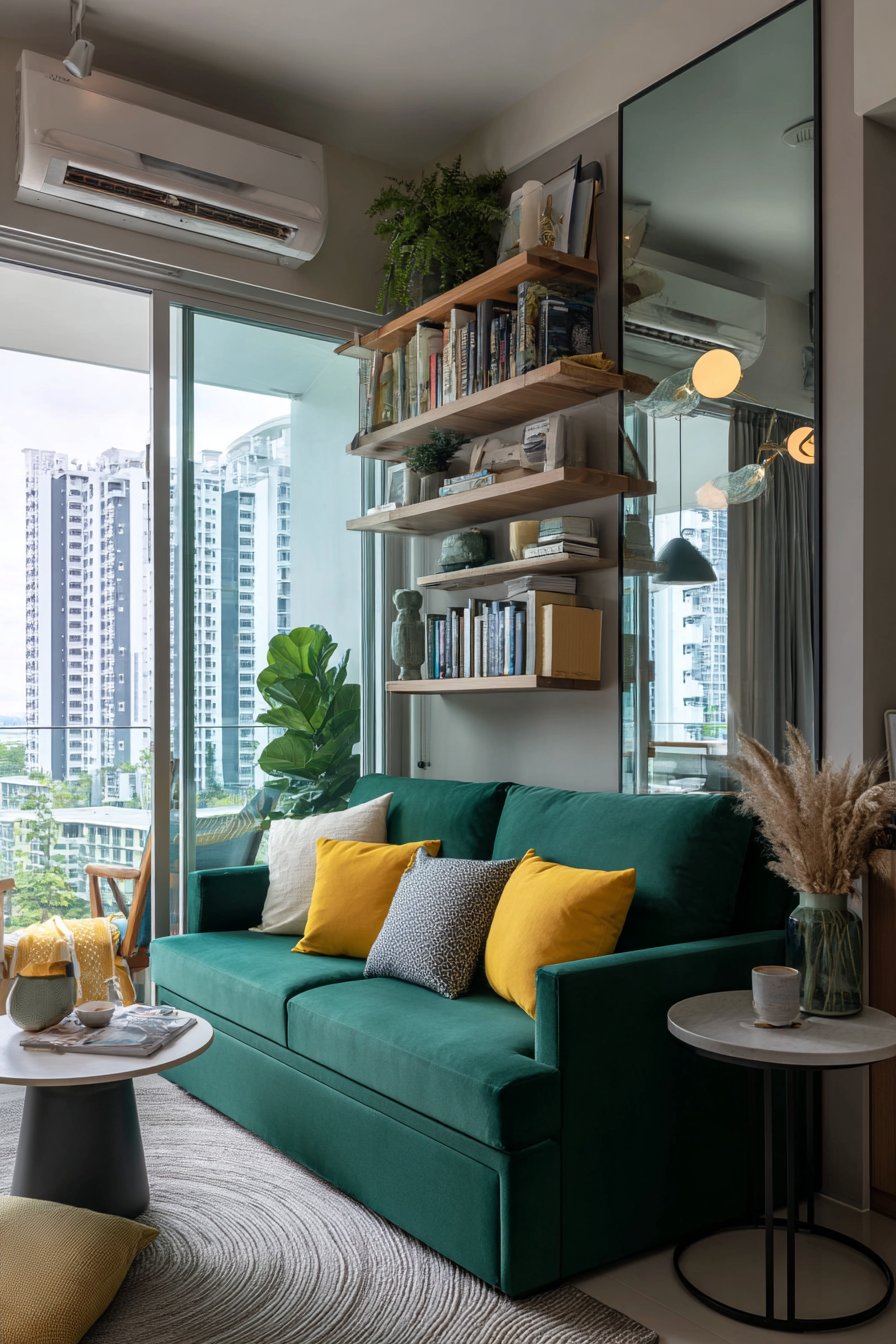 Wall-mounted floating shelves climb the vertical space above and around the sofa, drawing the eye upward and creating the illusion of height while providing essential storage and display area. These shelves hold books arranged both vertically and horizontally, small plants that add life without consuming floor space, and carefully selected decorative objects that reflect the inhabitant’s personality. The key is curation—in small spaces, every visible item must justify its presence through beauty, function, or both.