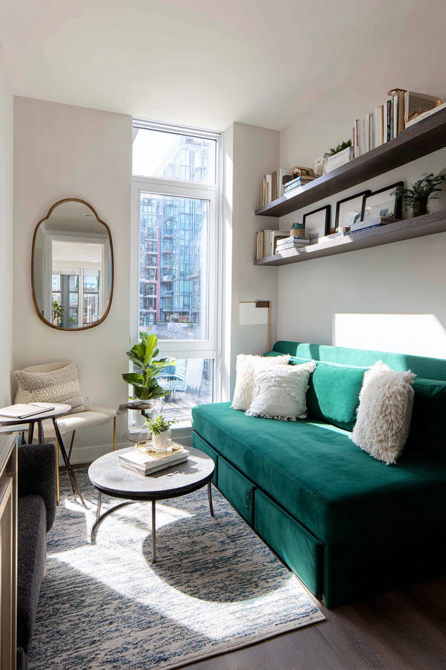 Key Design Tips: Choose furniture with exposed legs to create visual lightness and allow light to flow beneath pieces. Utilize vertical space aggressively with floor-to-ceiling shelving and wall-mounted storage. Select a bold sofa color to create a focal point rather than trying to make furniture “disappear” with neutral tones. Use mirrors strategically to reflect light and create depth, positioning them to reflect the room’s best features. Keep the floor as clear as possible, avoiding area rugs in very small spaces where they can make the room feel choppy and even smaller.