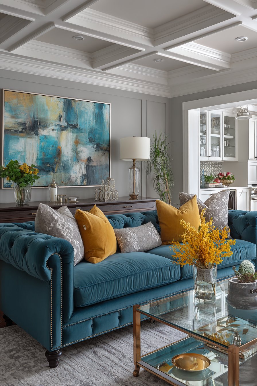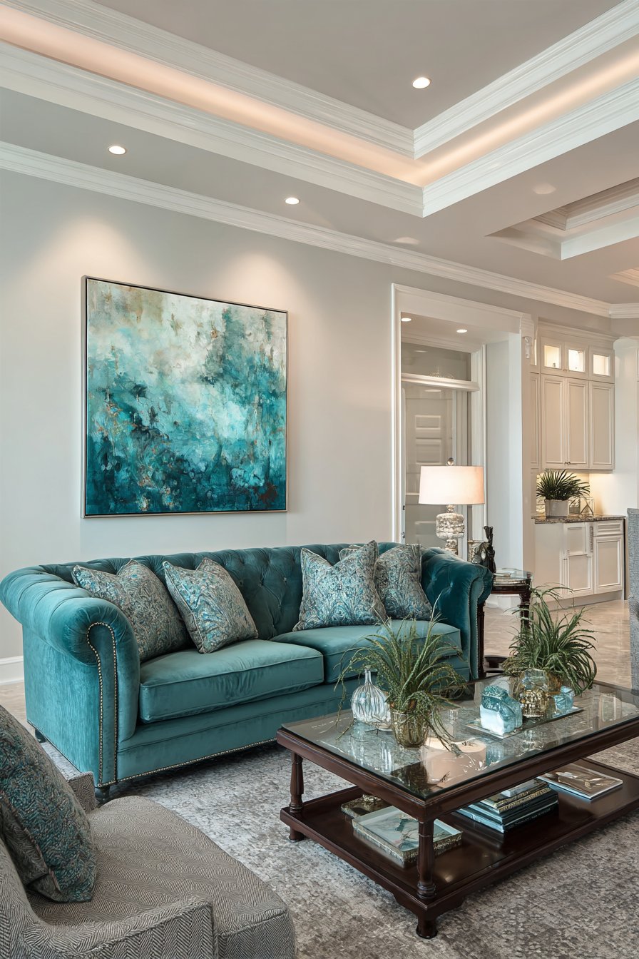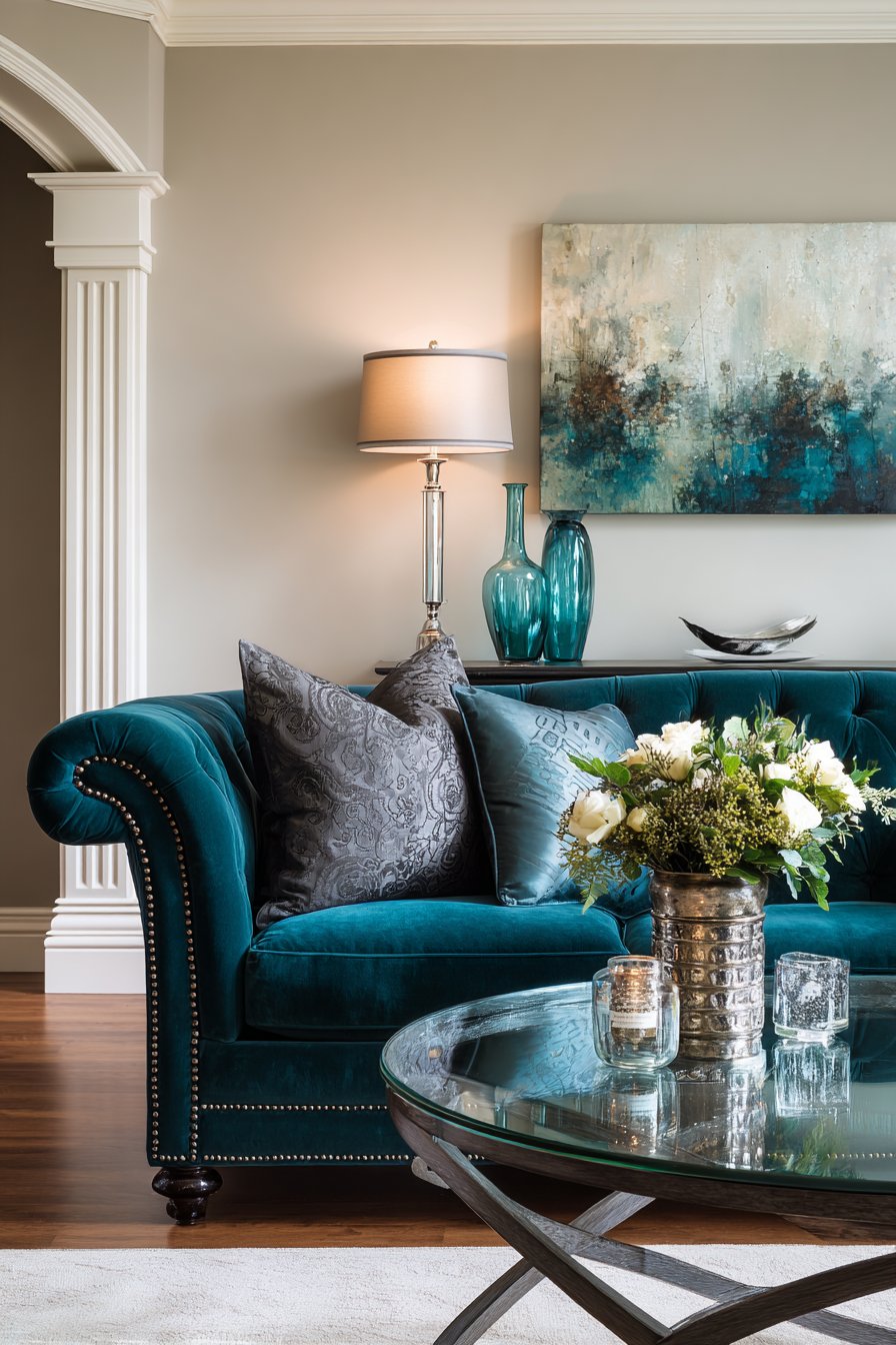 The transitional style bridges traditional elegance and contemporary sensibility, creating spaces that feel both timeless and current. A teal green tufted sofa with rolled arms and turned legs embodies this balanced approach, combining classic furniture silhouettes with a fresh, modern color choice. The button tufting adds texture and visual interest while referencing traditional upholstery techniques, yet the teal green hue prevents the piece from reading as dated or overly formal.