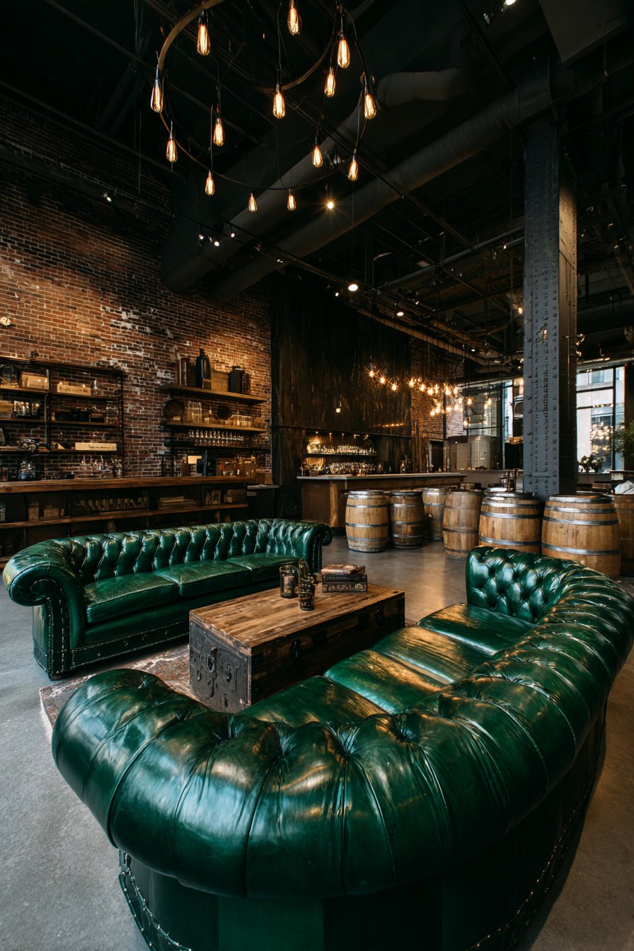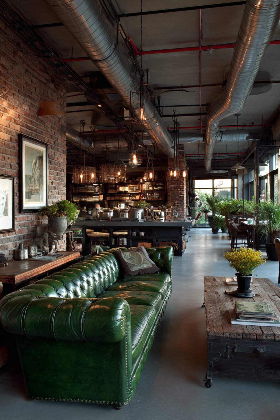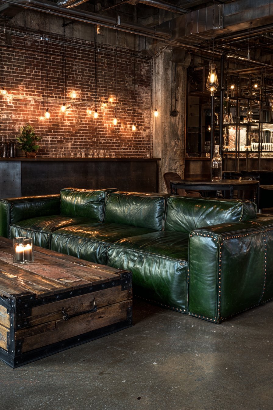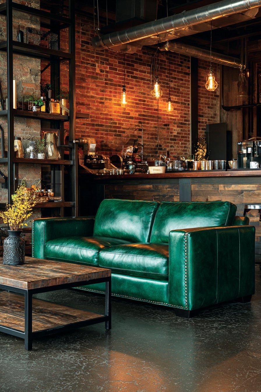 Industrial design celebrates raw materials, exposed infrastructure, and urban aesthetics—principles dramatically realized in a living room featuring a deep emerald green leather sofa with an exposed metal frame and riveted details. This isn’t the refined leather of traditional design; it’s tougher, more utilitarian, with visible stitching and metal hardware that reference factory equipment and industrial furniture. The emerald green color transforms what could be harsh or cold into something rich and inviting, proving that industrial style needn’t sacrifice comfort or visual warmth.