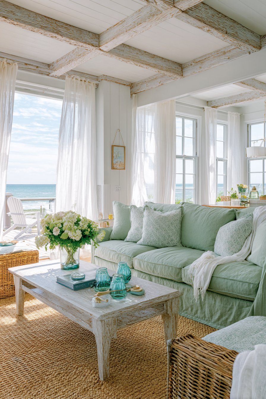 Natural fiber rugs in sisal or jute add texture underfoot while maintaining the neutral, natural palette essential to coastal aesthetics. Wicker accent chairs introduce additional seating without weight, their open-weave construction maintaining the airy feel. Blue-green glass accessories—perhaps in the form of vintage bottles, modern sculptures, or decorative bowls—catch and refract light while echoing ocean colors. Abundant natural light through gauze curtains creates the sun-drenched atmosphere characteristic of coastal spaces, making the seafoam green sofa appear to glow from within like shallow water illuminated by sunlight.