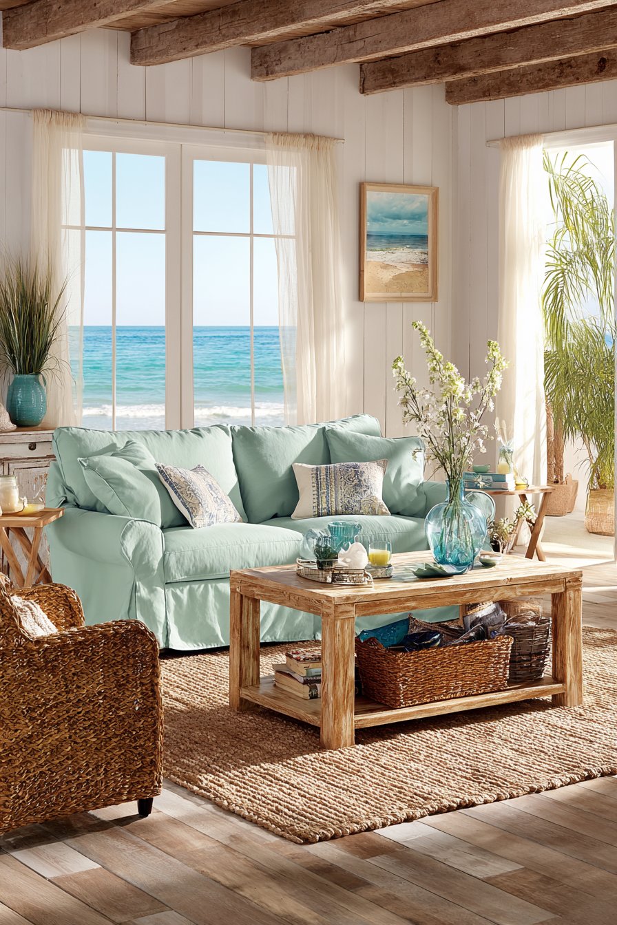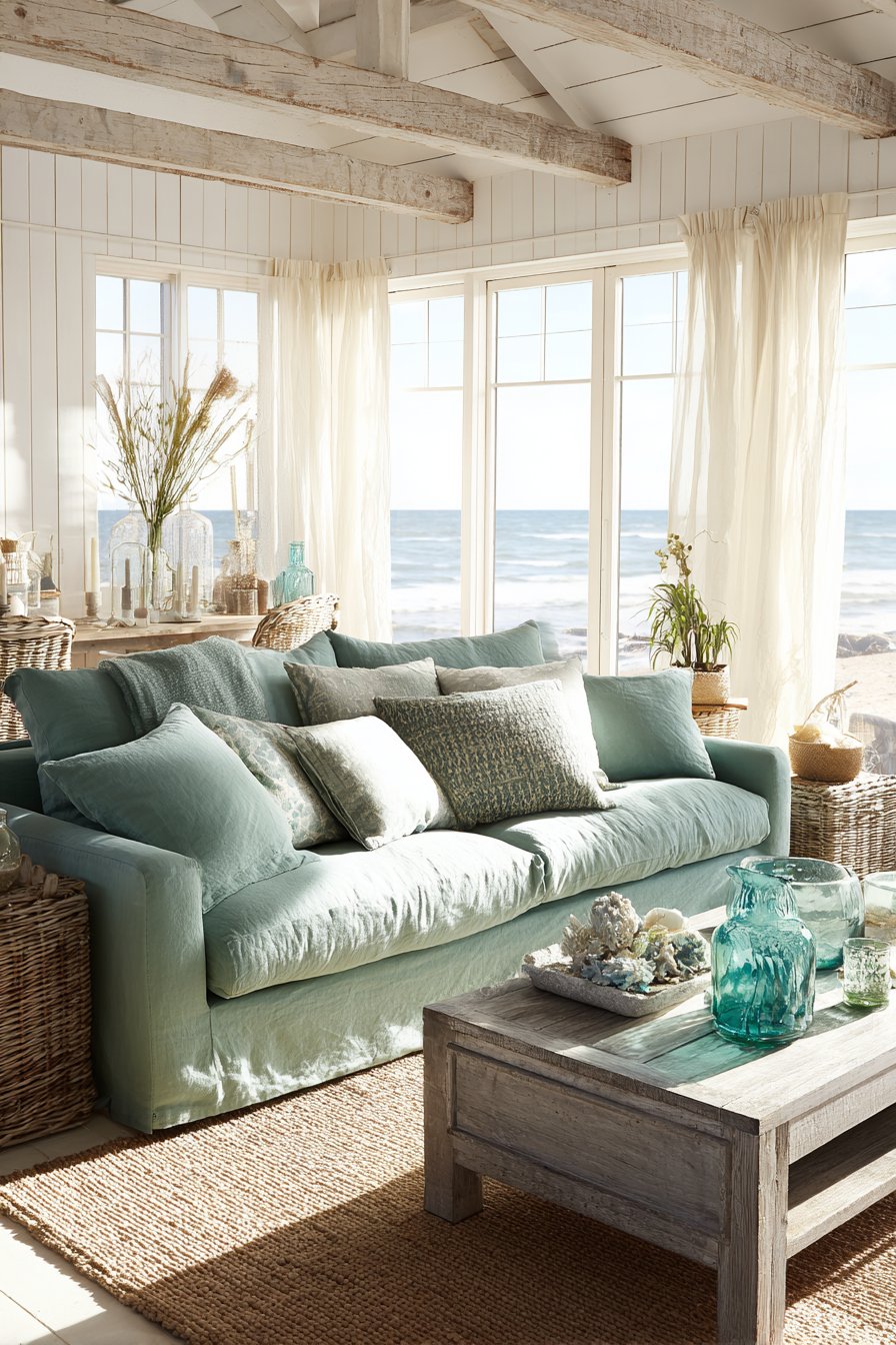 Coastal design evokes the relaxed, sun-bleached beauty of beachside living, creating spaces that feel perpetually on vacation. A seafoam green linen sofa with slipcover styling and relaxed cushions perfectly captures this aesthetic, its soft green-blue hue reminiscent of shallow coastal waters and sea glass. The slipcover construction communicates casual elegance—this is furniture designed for real life, for sandy feet and wet bathing suits, for the comfortable informality of summer living.