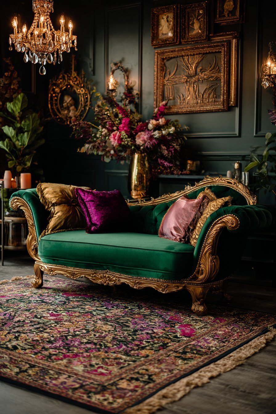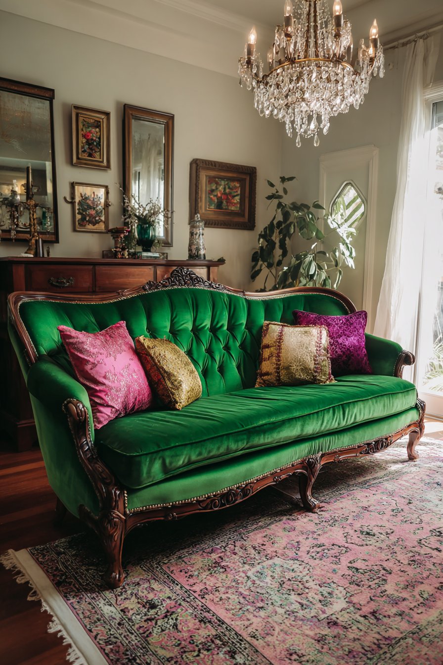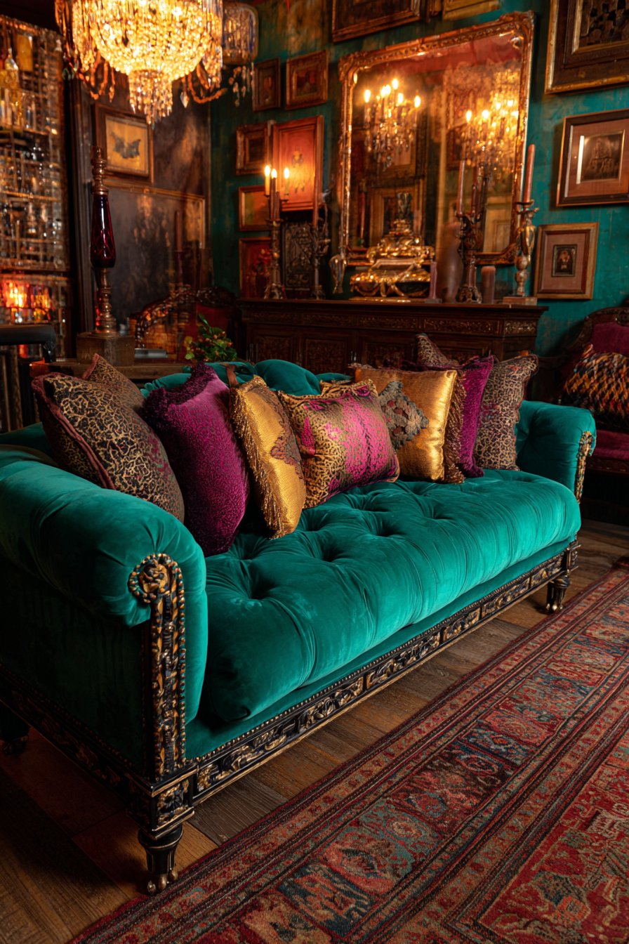 Gallery walls of ornate frames climb the walls around the sofa, displaying art, mirrors, and perhaps even three-dimensional objects in a salon-style arrangement. A crystal chandelier overhead provides sparkle and glamour, its prismatic elements scattering rainbow light across surfaces. Warm tungsten lighting creates pools of golden illumination that enhance the space’s luxurious character while highlighting the emerald velvet’s depth. This is a room designed for drama, for dinner parties and cocktail hours, for the pleasure of surrounding oneself with beautiful things collected over time.