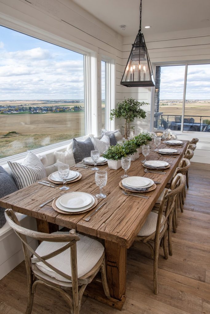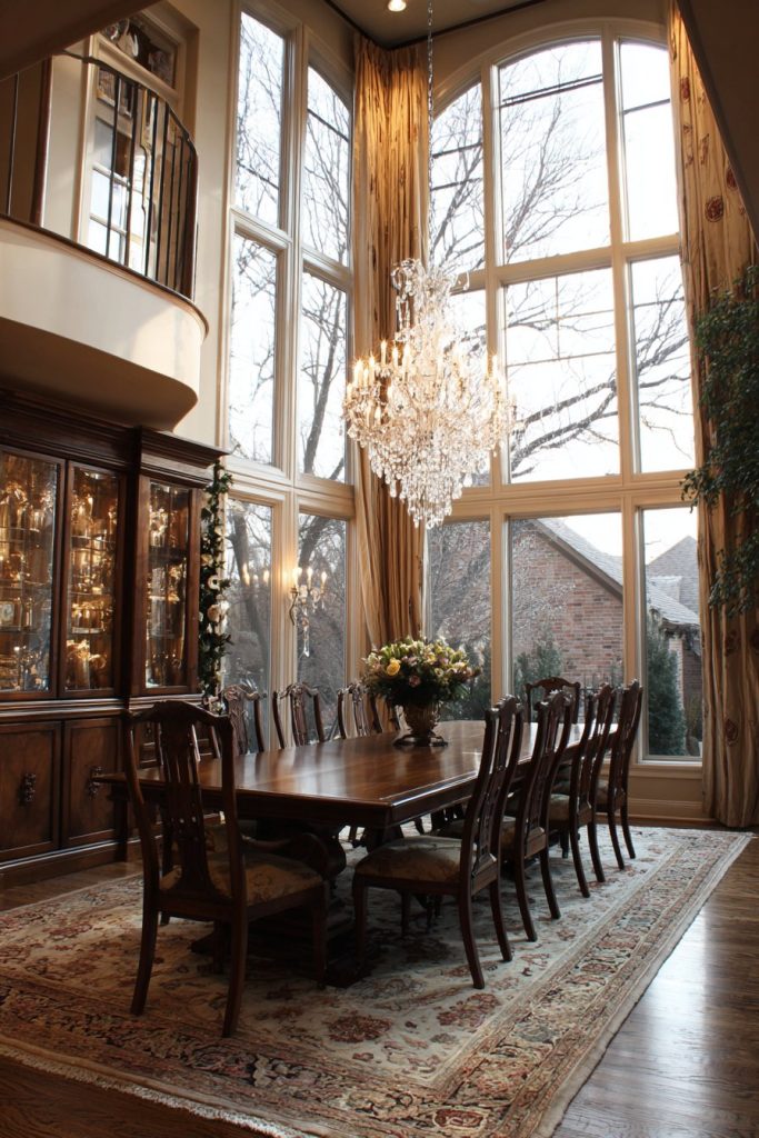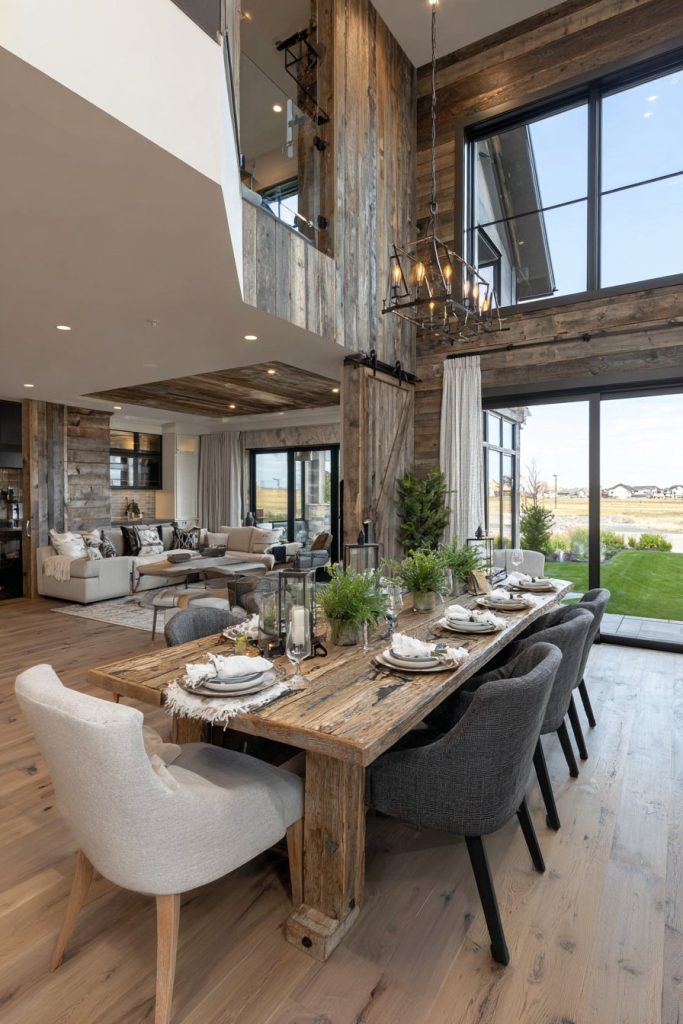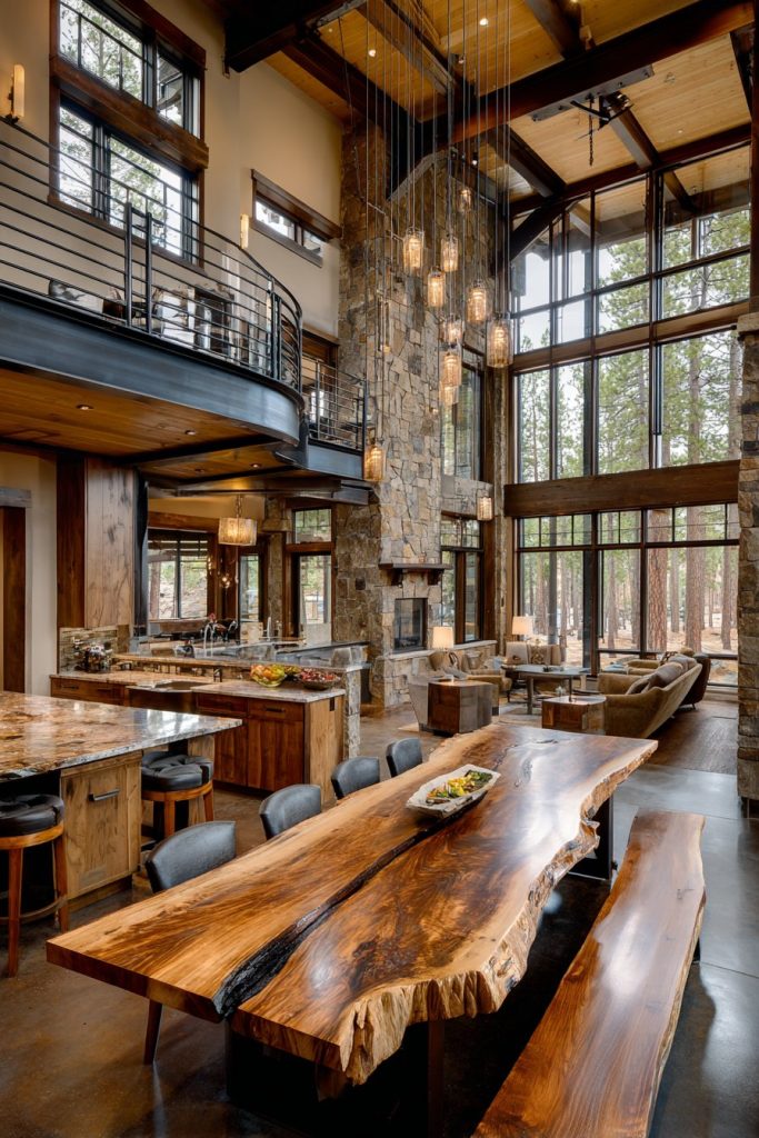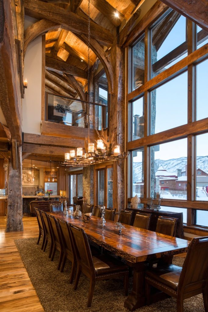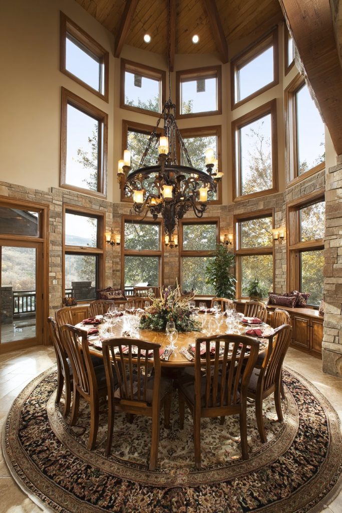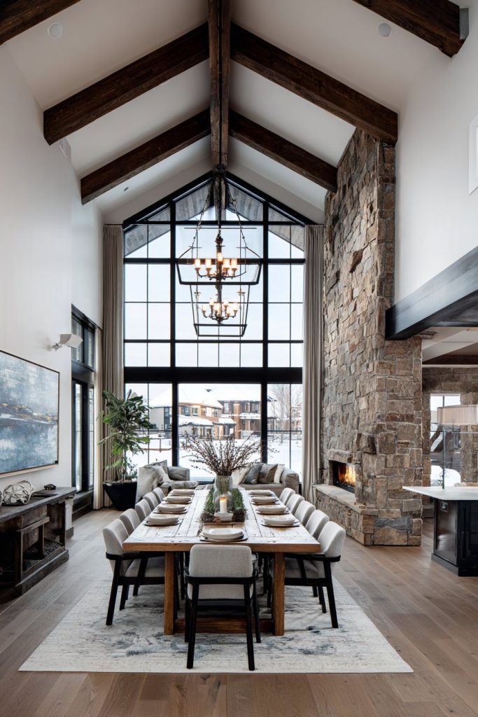 The two-story window wall becomes a defining feature, flooding the room with natural light while providing stunning views that change throughout the day and seasons. This abundance of natural light requires careful consideration of window treatments and artificial lighting to ensure the space remains comfortable and functional during evening hours. A rustic chandelier scaled appropriately for the soaring ceiling provides intimate lighting at table level while complementing the room’s architectural drama.