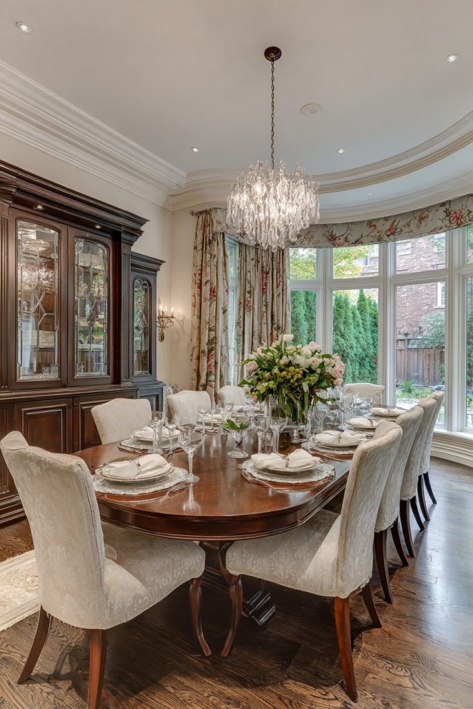 The separate sideboard area provides essential serving and storage functions while maintaining the clean lines and formal aesthetic crucial for traditional design. Crystal sconces add elegant ambient lighting while a grand chandelier serves as the room’s focal point, creating layers of illumination that enhance the sophisticated atmosphere. The interplay between natural and artificial light becomes particularly important in traditional spaces where ambiance is paramount.