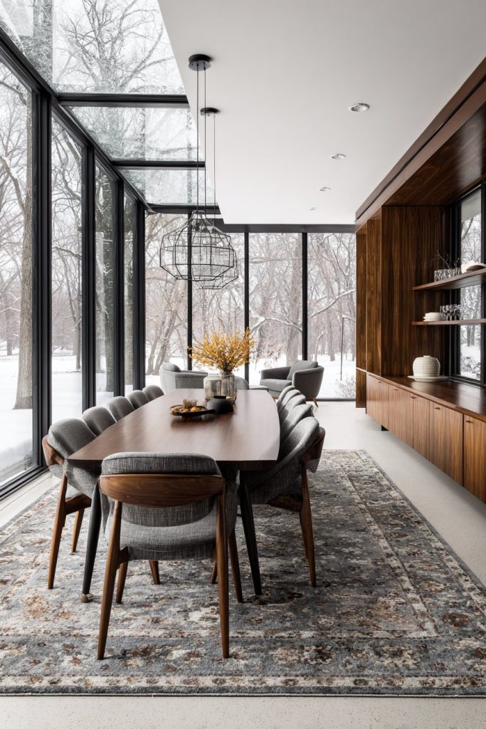 The clean lines and sophisticated simplicity of mid-century modern design translate beautifully to large dining spaces, where a sleek walnut dining table for ten becomes the centerpiece beneath a geometric pendant light fixture that celebrates the era’s love of bold, sculptural forms. The generous room dimensions allow for the inclusion of additional seating areas with vintage lounge chairs that provide comfortable spaces for pre and post-dinner conversation.
