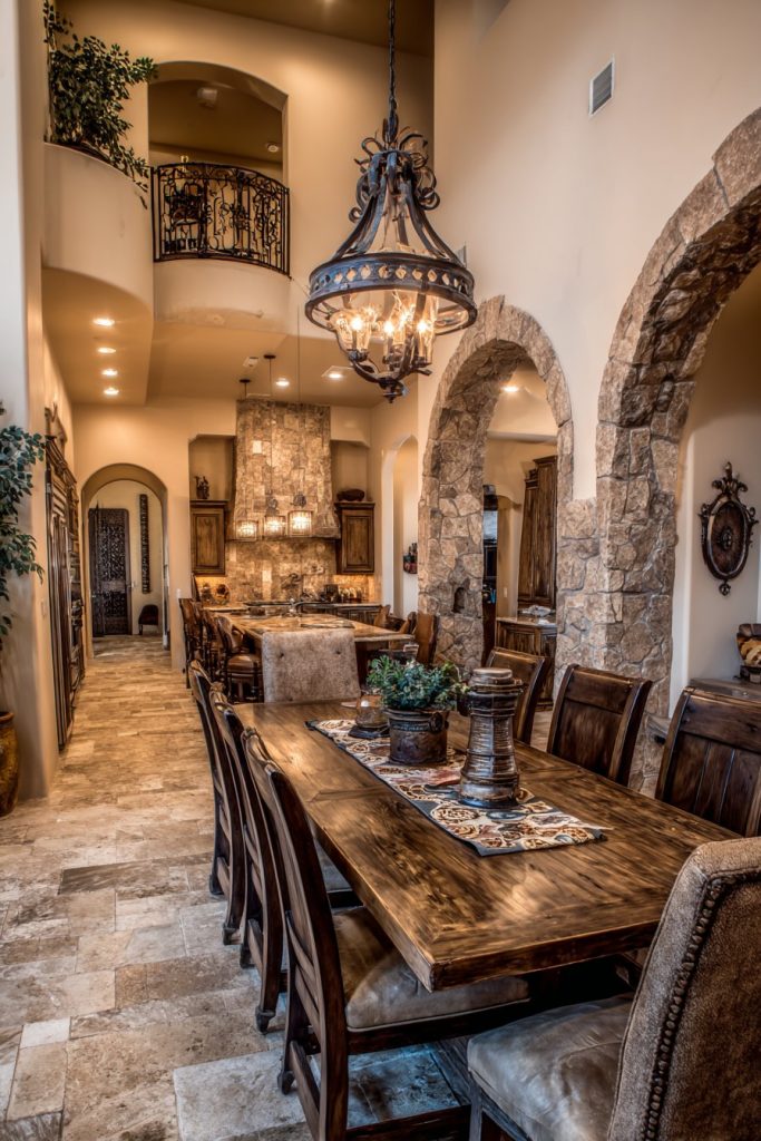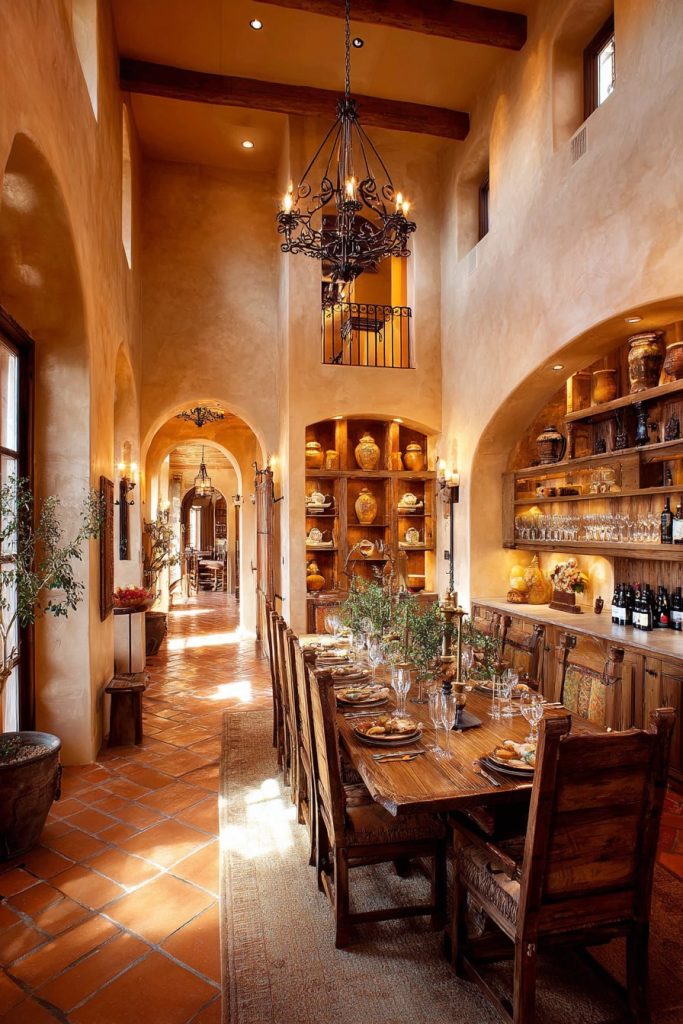 Terra cotta tile flooring and textured plaster walls create authentic warmth while providing the durability necessary for busy family spaces. The natural materials age beautifully while requiring minimal maintenance, making them ideal choices for large dining areas that see frequent use. The wrought iron chandelier adds both functional lighting and authentic period character that ties the design together.
