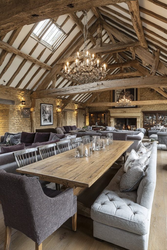 Double-height ceilings with exposed wooden beams create one of the most dramatic possibilities for large dining room design, where vertical space becomes as important as floor area. A substantial farmhouse-style dining table that seats ten anchors the room at ground level while exposed beams draw the eye upward, creating a sense of grandeur that’s both rustic and sophisticated. The interplay between horizontal and vertical elements creates visual interest while maintaining the cozy, welcoming atmosphere essential for dining spaces.