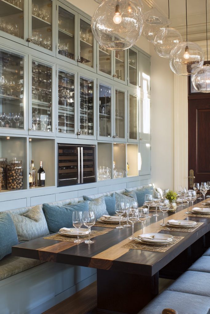 Built-in china cabinets line one wall, providing both practical storage and display opportunities for fine dinnerware and family heirlooms. These custom storage solutions maximize the room’s functionality while maintaining the clean, uncluttered aesthetic essential for formal dining spaces. The generous proportions allow for comfortable circulation around the table, ensuring that serving and conversation flow naturally throughout the space.