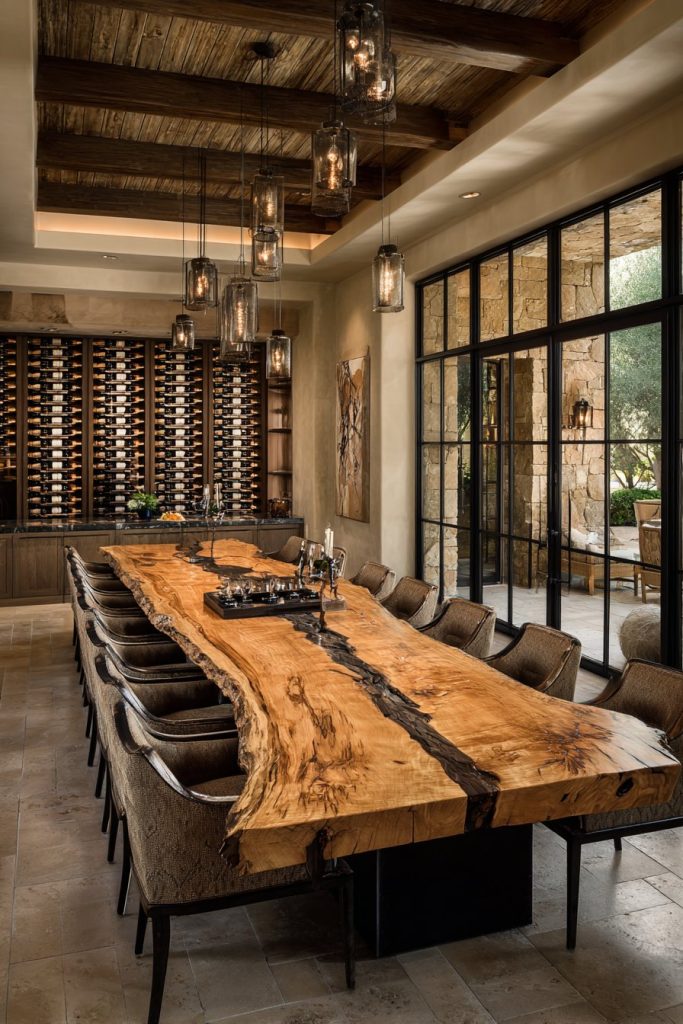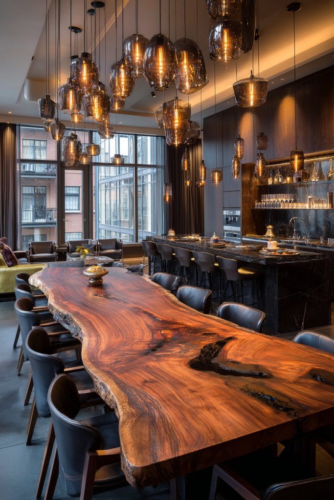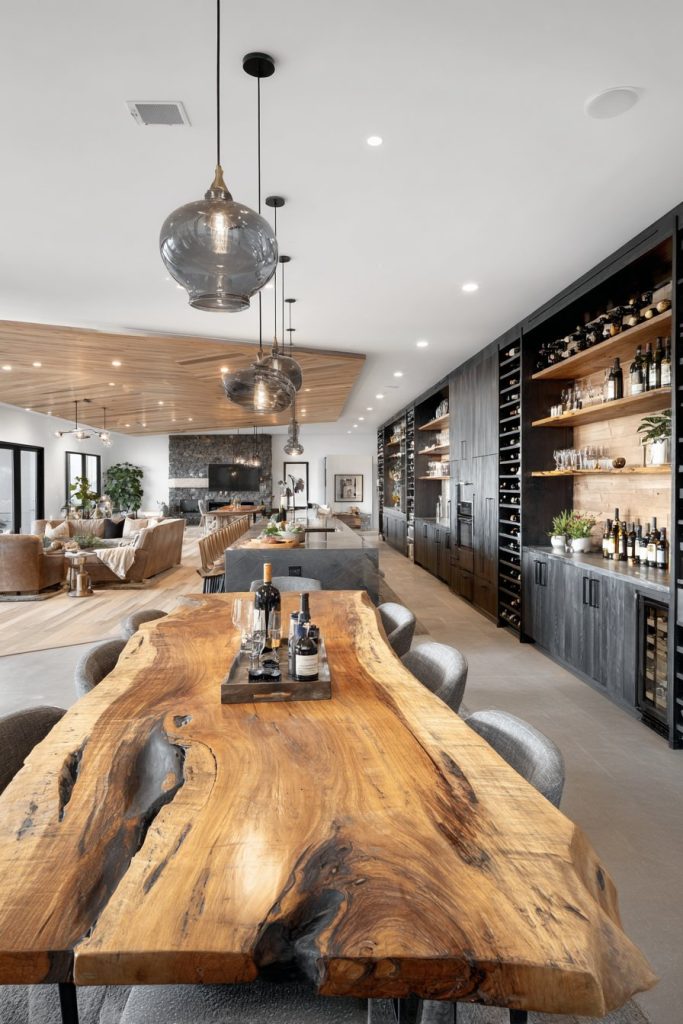 Modern large dining room ideas often embrace the open-concept philosophy, creating seamless connections between cooking, dining, and entertaining areas. A massive live-edge dining table becomes the star of this design approach, showcasing the natural beauty of wood grain while accommodating multiple conversation areas within the expansive space. The organic edge of the table softens the potentially overwhelming scale of a large room while providing a stunning focal point that celebrates natural materials.