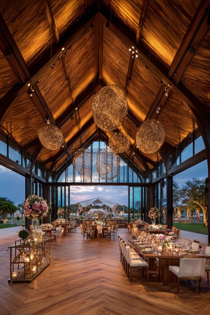 - Use rich wood tones to add warmth and sophistication to large, potentially cold spaces