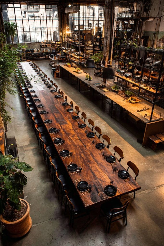 - Balance industrial elements with warm materials to create inviting dining spaces