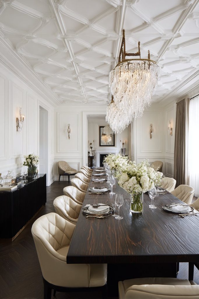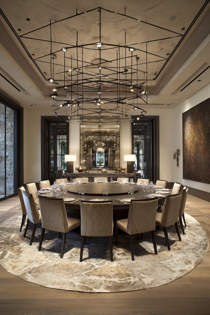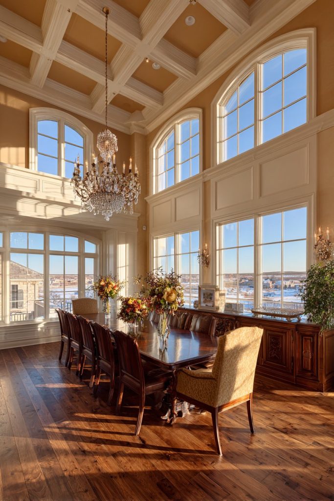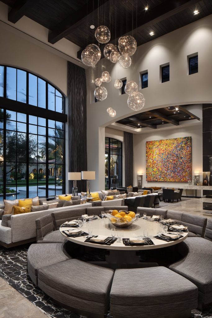 Floor-to-ceiling windows draped in elegant fabric create a dramatic backdrop while flooding the room with natural light during daytime hours. The interplay between natural and artificial lighting becomes crucial in such a large space, where a statement crystal chandelier serves as both functional illumination and artistic centerpiece. The chandelier’s positioning directly above the dining surface ensures optimal lighting for meals while creating beautiful refractive patterns that dance across the room’s surfaces.