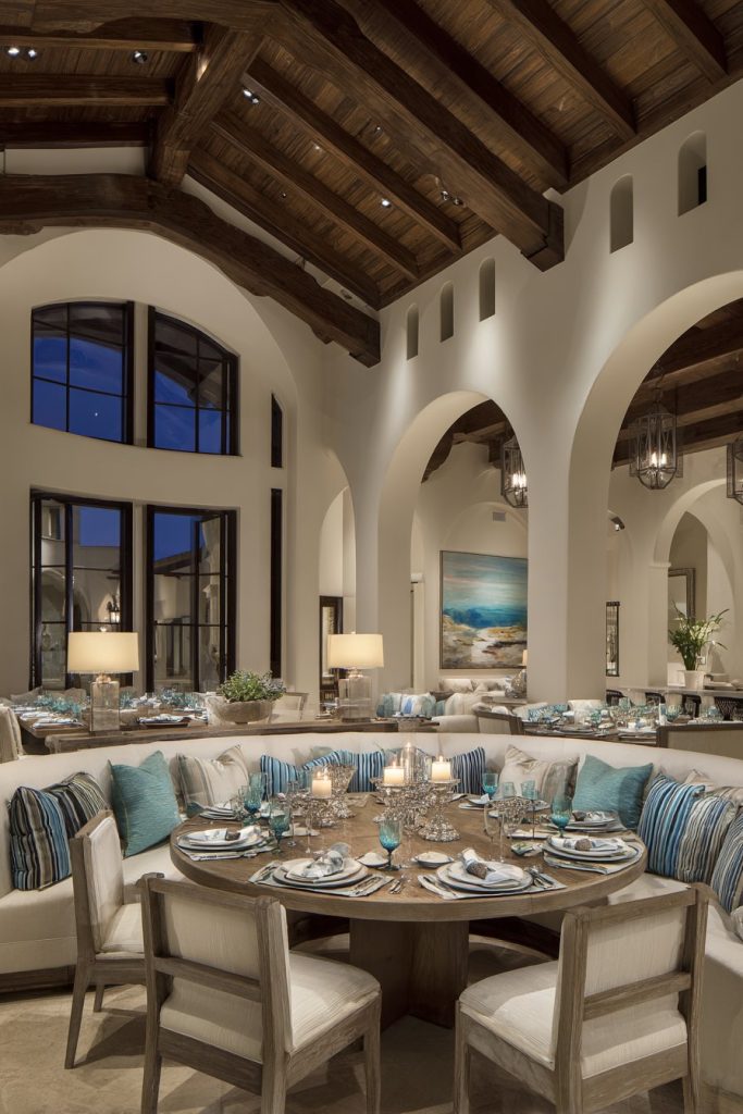 The relaxed elegance of coastal design creates remarkably peaceful large dining spaces where weathered wood dining tables that seat twelve capture the essence of seaside living while built-in window seats with storage provide both additional seating and practical storage solutions. The positioning of the dining area to capture ocean views transforms meals into memorable experiences while connecting the interior space to its natural surroundings.
