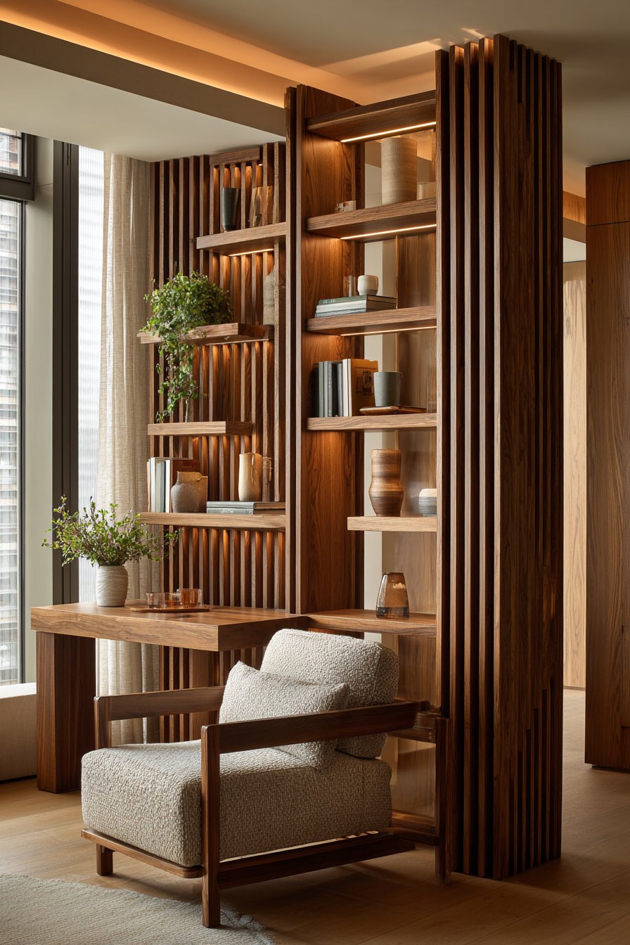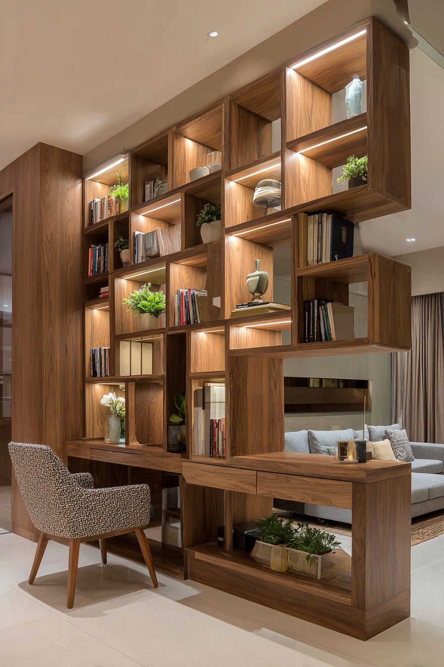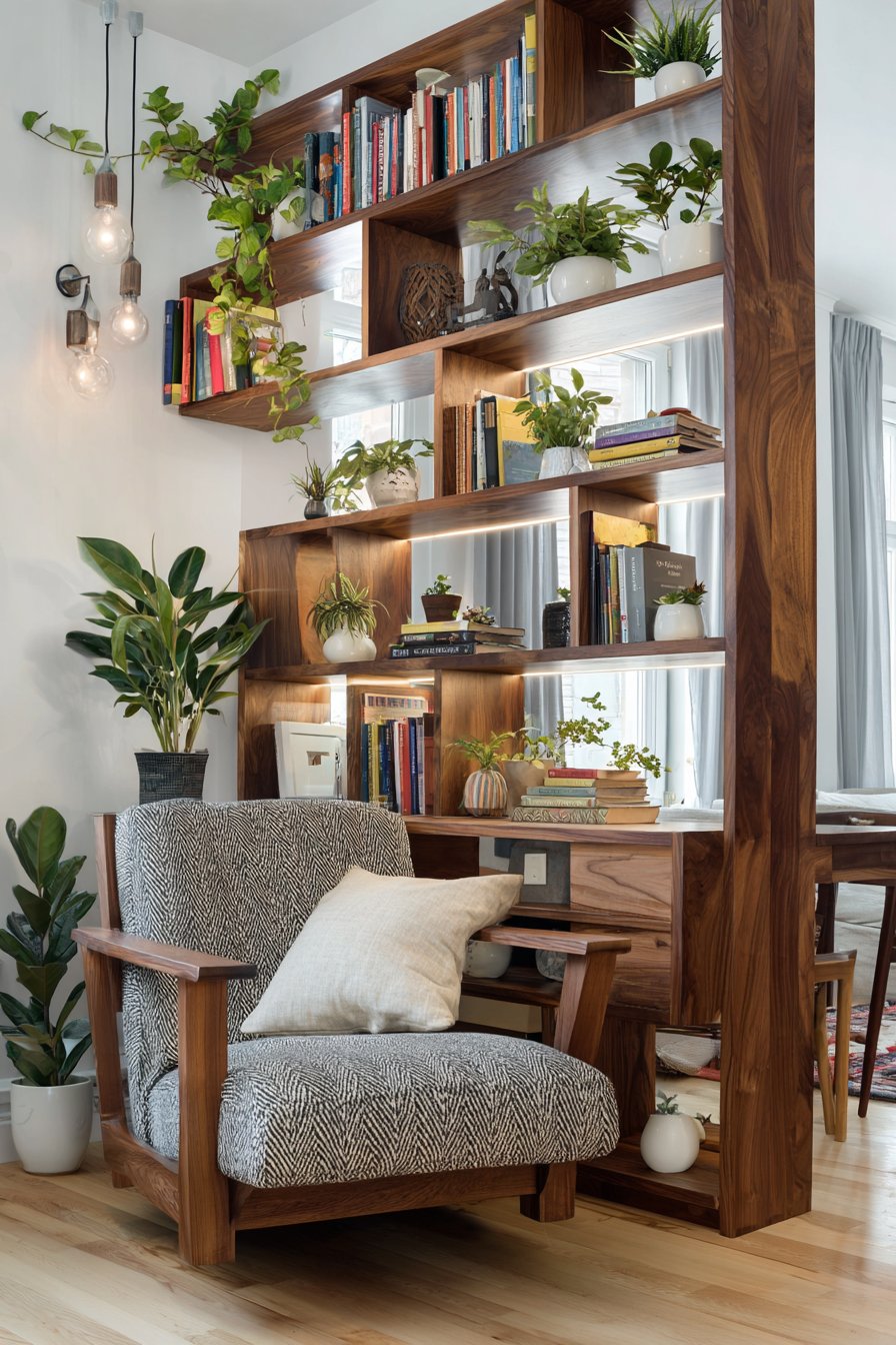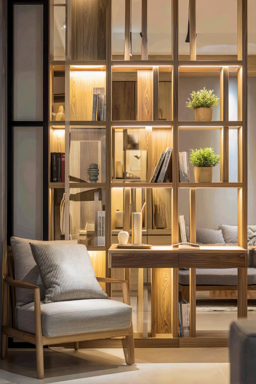 Few partition solutions combine functionality and aesthetics as effectively as the floor-to-ceiling bookshelf divider, a timeless design that transforms necessary storage into an architectural feature. Crafted from natural walnut wood with its characteristic rich, warm tones and distinctive grain patterns, this double-sided unit serves both the living area and adjacent home office space with equal elegance. The shelving displays a carefully curated collection of books, decorative objects, pottery pieces, and potted plants, creating a living gallery that’s accessible and visually appealing from both sides. Built-in LED strip lighting illuminates each shelf level, ensuring that the display remains visually striking even during evening hours while providing practical task lighting for reading book spines and finding items.