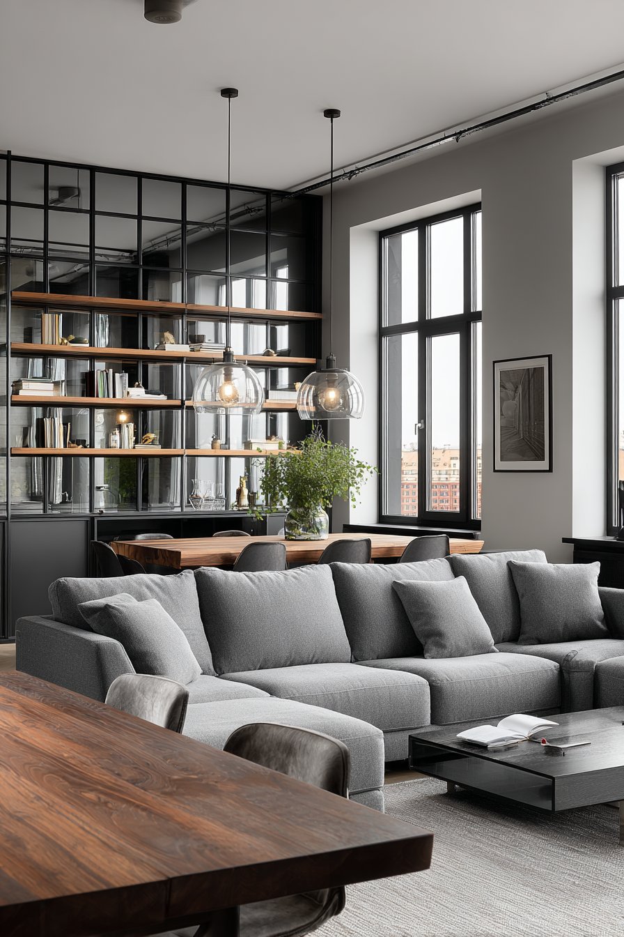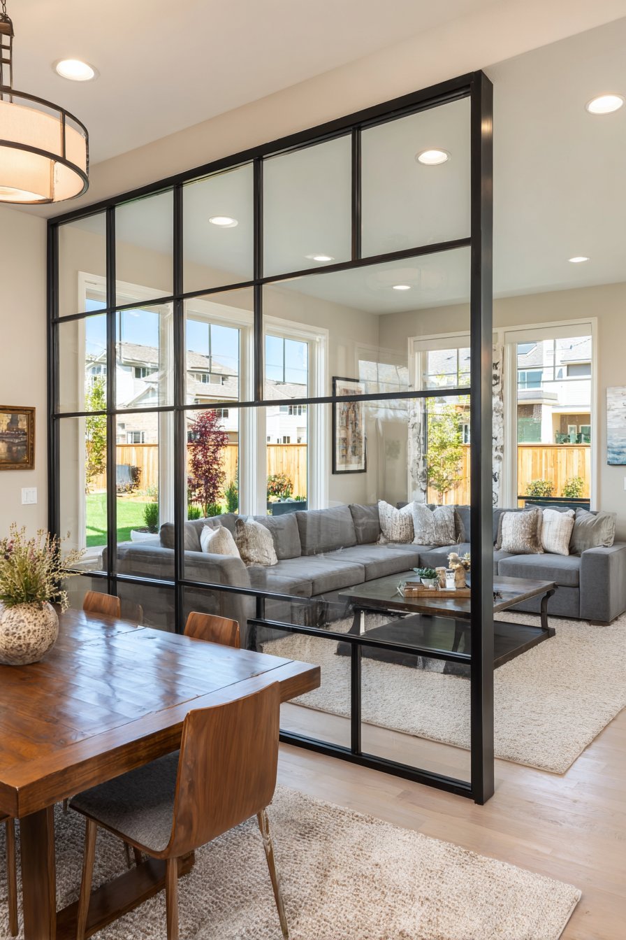 The contemporary living space finds one of its most sophisticated expressions in the geometric metal frame partition, a design element that masterfully balances industrial aesthetics with modern minimalism. This partition concept features a matte black metal framework arranged in clean geometric patterns, creating an architectural statement that defines space without overwhelming it. The true genius lies in the integration of floating glass panels within the metal structure, allowing light to flow freely while maintaining visual connection between zones. On one side, a contemporary grey sectional sofa establishes the primary seating area, while the opposite side accommodates a wooden dining table surrounded by mid-century modern chairs, creating a seamless transition between relaxation and dining functions.